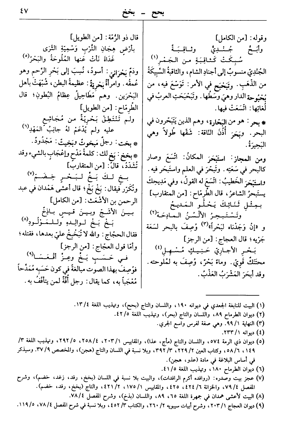 ومن المجاز: استبحر المكان: اتسع وصار كالبحر في سعته. وتبحر في العلم واستبحر فيه. واستبحر الخطيب: اتسع له القول، وفي مديحك يستبحر الشاعر. قال الطرماح: