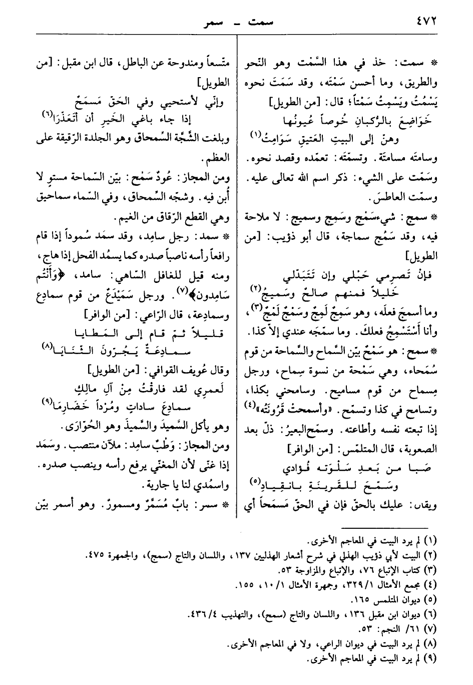 ومن المجاز: وطب سامد: ملآن منتصب. وسمد إذا غنى لأن المغني يرفع رأسه وينصب صدره. واسمدي لنا يا جارية.