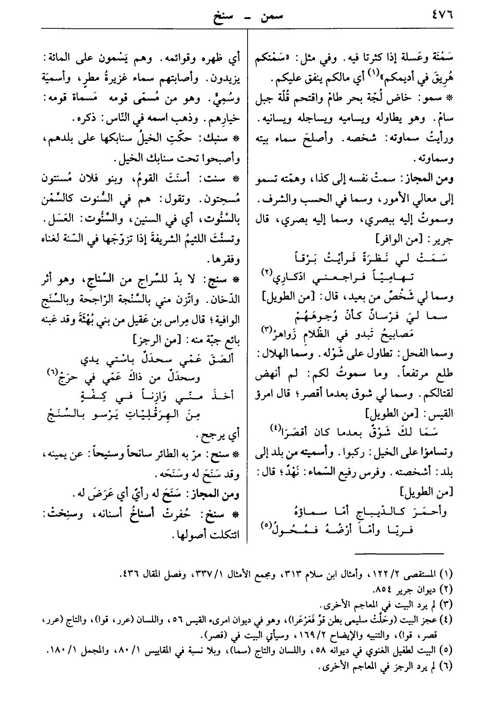 أي ظهره وقوائمه. وهم يسمون على المائة: يزيدون. وأصابتهم سماء غزيرة مطر، وأسمية وسمي. وهو من مسمى قومه ومسماة قومه: خيارهم. وذهب اسمه في الاس: ذكره.