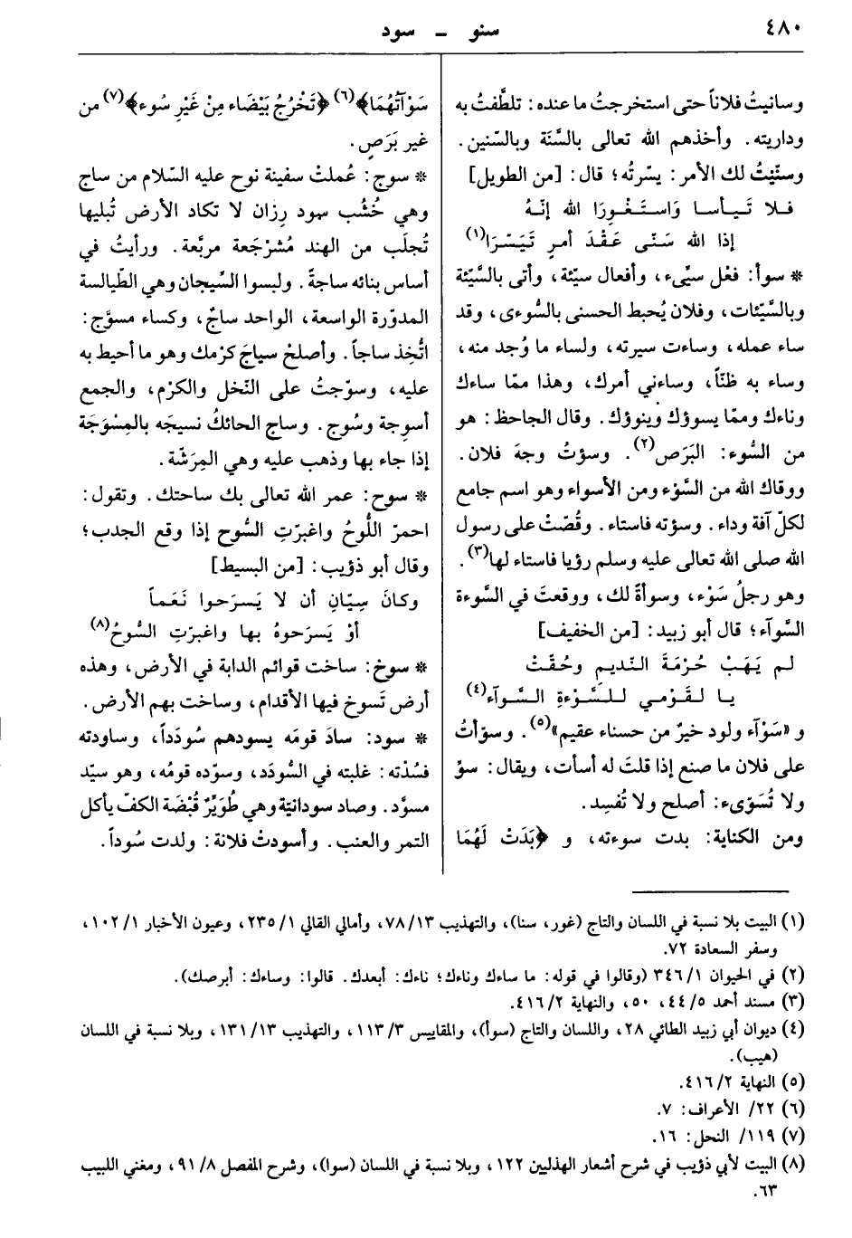 ومن الكناية: بدت سوءته، و" بدت لهما سوآتهما " " تخرج بيضاء من غير سوء " من غير برص.
