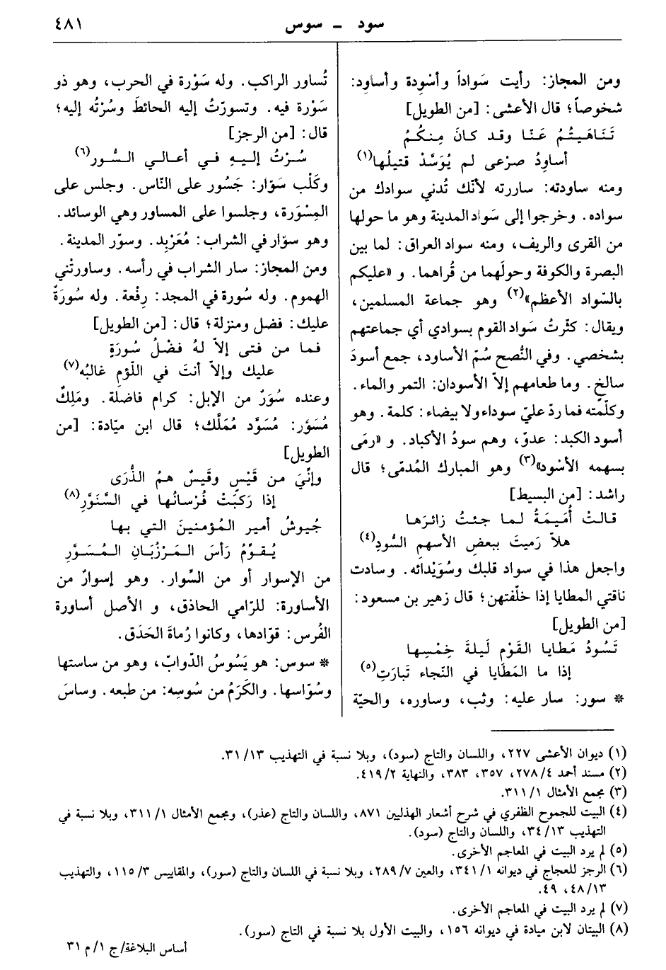 ومنه ساودته: ساررته لأنك تدني سوادك من سواده. وخرجوا إلى سواد المدينة وهو ما حولها من القرى والريف، ومنه سواد العراق: لما بين البصرة والكوفة وحولهما من قراهما. وعليكم بالسواد الأعظم وهو جماعة المسلمين، ويقال: كثرت سواد القوم بسوادي أي جماعتهم بشخصي. وفي النصح سم الأساود، جمع أسود سالخ. وما طعامهم إلا الأسودان: التمر والماء. وكلمته فما ردّ عليّ سوداء ولا بيضاء: كلمة. وهو أسود الكبد: عدوّ، وهم سود الأكباد. و" رمى بسهمه الأسود " وهو المبارك المدمى. قال راشد: