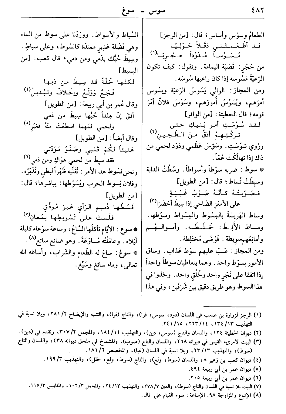 ومن المجاز: الوالي يسوس الرعية ويسوس أمرهم، ويسوس أمورهم، وسوس فلان أمر قومه. قال الحطيئة: