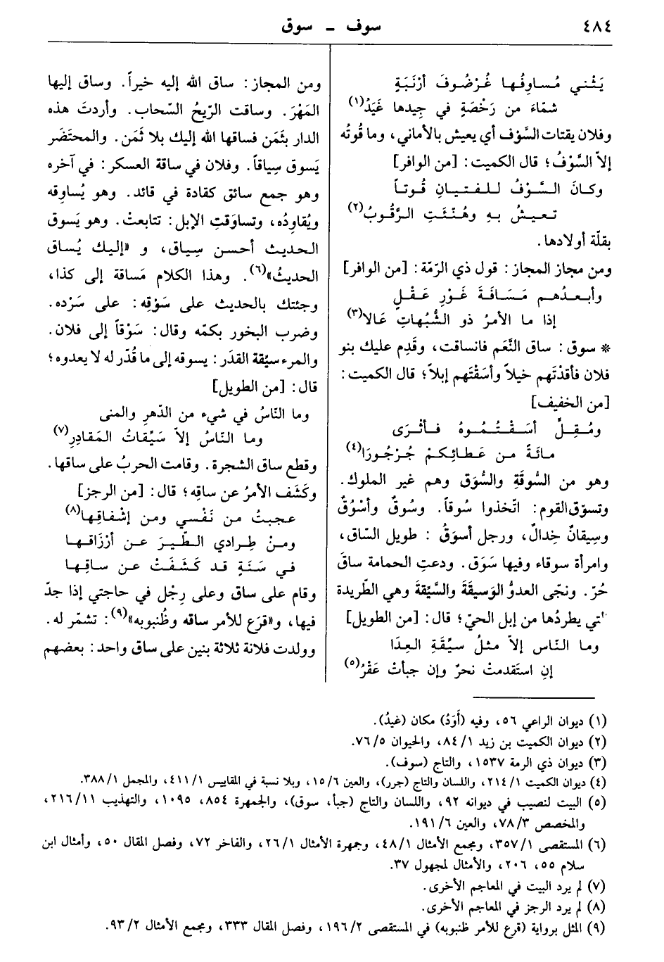 وهو من السوقة والسوق وهم غير الملوك. وتسوق القوم: اتخذوا سوقاً. وسوق وأسوق وسيقان خدال، ورجل أسوق: طويل الساق، وامرأة سوقاء وفيها سوق. ودعت الحمامة ساق حر. ونجى العدو الوسيقة والسيقة وهي الطريدة التي يطردها من إبل الحي. قال: