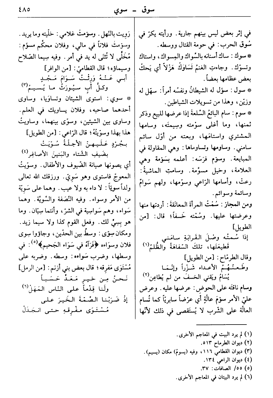 أي يصونها صيانة الضيوف والأطفال. وسويت المعوج فاستوى، وهو سويّ. ورزقك الله تعالى ولداً سوياً: لا داء به ولا عيب. وهما على سوية من الأمر وسواء. ويه النصفة والسوية. وهما سواء، وهم سواسية في الشر، وأنتما سيان. وما هو بسيٍّ لك. وفعل القوم كذا ولا سيما زيد. ومكان سوى: وسط بين الحدين. وجاؤا سوى فلان وسواءه " فرآه في سواء الجحيم ": في وسطها، وضرب سواءه: وسطه. وضربه على مستوى مفرقه. قال بعض بني أزنم: