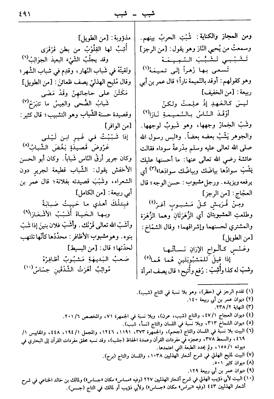 وشبّ الخمار وجهها، وهو شبوب لوجهها. والجوهر يشب بعضه بعضاً. و" لبس رسول الله صلى الله تعالى عليه وسلم مدرعة سوداء فقالت عائشة رضي الله تعالى عنها: ما أحسنها عليك يشب سوادها بياضك وبياضك سوادها " أي يرفعه ويزيده. ورجل مشبوب: حسن الوجه. قال العجاج: