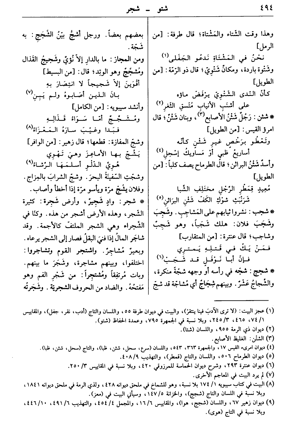واد شجير، وأرض شجرة: كثيرة الشجر، وهذه الأرض أشجر من هذه. وكنا في الشجراء وهي الجشر الملتف كالأجمة. وقد شاجر المال إذا فنى البقل فصار إلى الشجر يرعاه. وبعير مشاجر. واشتجر القوم وتشاجروا: اختلفوا، وبينهم مشاجرة، وشجر ما بينهم. وبات مرتفقاً ومشتجراً: من شجر الفم وهو مفتحه. والضاد من الحروف الشجرية. وشجرته