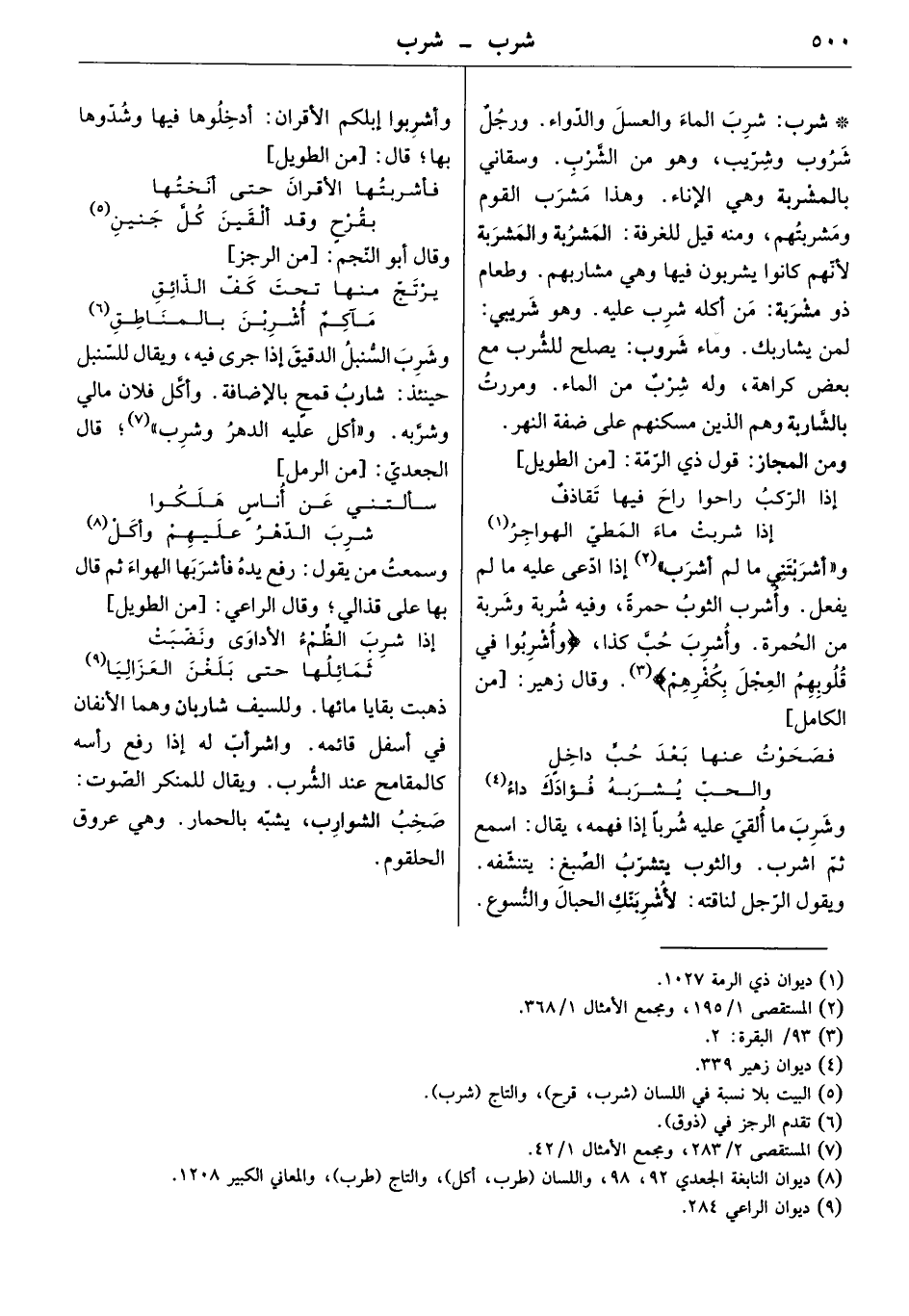 شرب الماء والعشل والدواء. ورجل شروب وشريب، وهو من الشرب. وسقاني بالمشربة وهي الإناء، وهذا مشرب القوم ومشربتهم، ومنه قيل للغرفة: المشربة لأنهم كانوا يشربون فيها وهي مشاربهم. وطعام ذو مشربة: من أكله شرب عليه. وهو شريبي: لمن يشاربك. وماء شروب: يصلح للشرب مع بعض كراهة، وله شرب من الماء. ومررت بالشاربة وهم الذين مسكنهم على ضفة النهر.