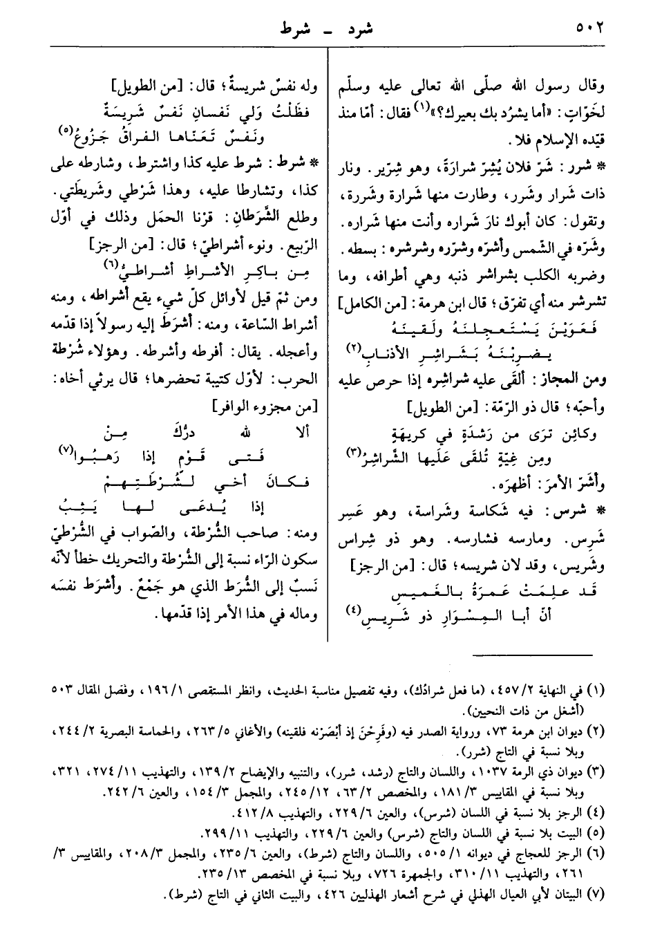 ومنه: صاحب الشرطة، والصواب في الشرطي سكون الراء نسبة إلى الشرطة والتحريك خطأ لأنه نسب إلى الشرط الذي هو جمع. وأشرط نفسه وما له في هذا الأمر إذا قدّمها.