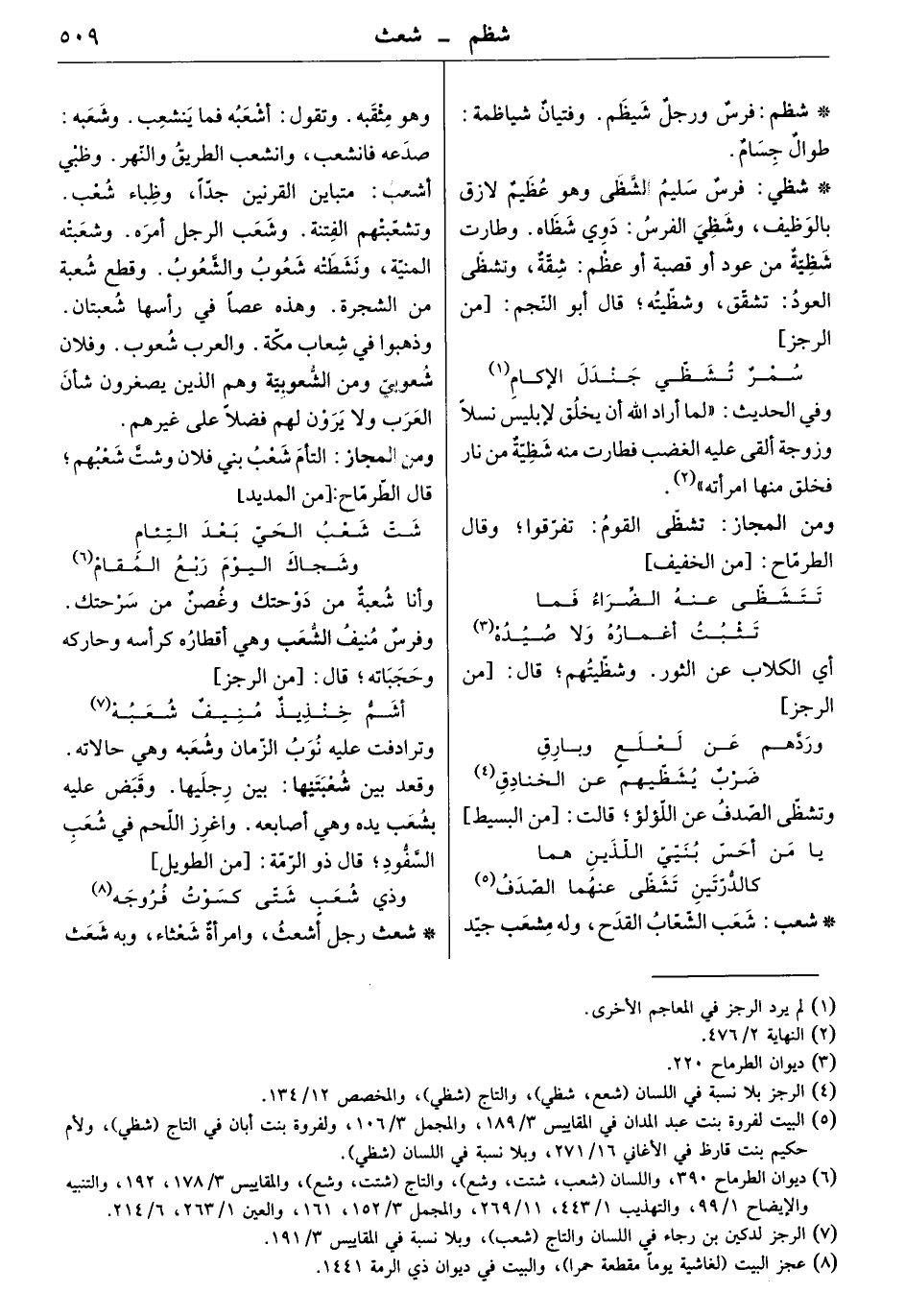 وترادفت عليه نوب الزمان وشعبه وهي حالاته. وقعد بين شعبتيها: بين رجليها. وقبض عليه بشعب يده وهي أصابعه. واغرز اللحم في شعب السفود. قال ذو الرمة: