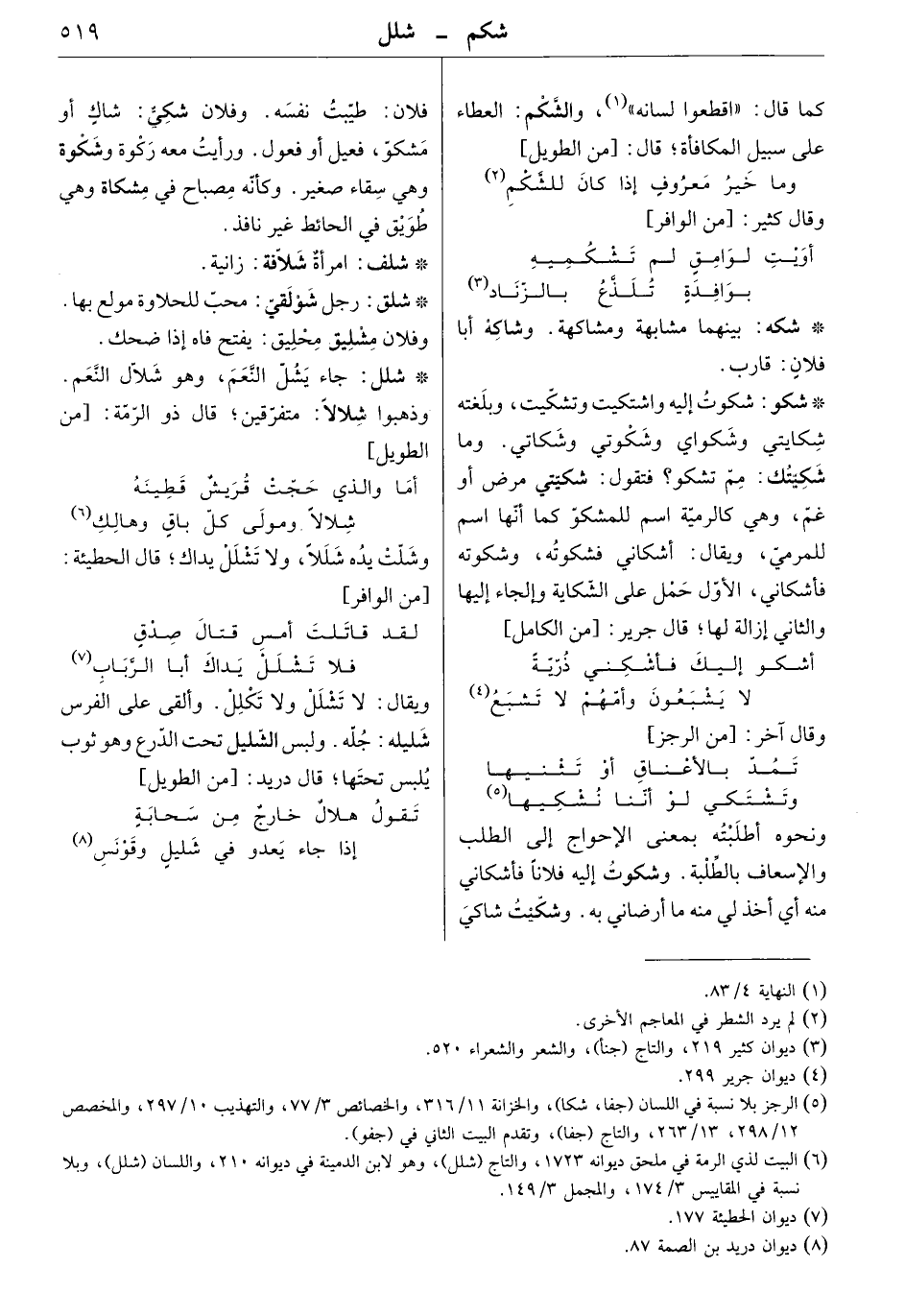 تمد بالأعناق أو تثنيهاوتشتكي لو أننا نشكيها ونحوه أطلبته بمعنى الإحواج إلى الطلب والإسعاف بالطلبة. وشكوت إليه فلاناً فأشكاني منه أي أخذ لي منه ما أرضاني به. وشكّيت شاكيَ فلان: طيبت نفسه. وفلان شكي: شاك أو مشكو، فعيل أو فعول. ورأيت معه ركوة وشكوة وهي سقاء صغير. وكأنه مصباح في مشكاة وهي طويق في الحائط غير نافذ.