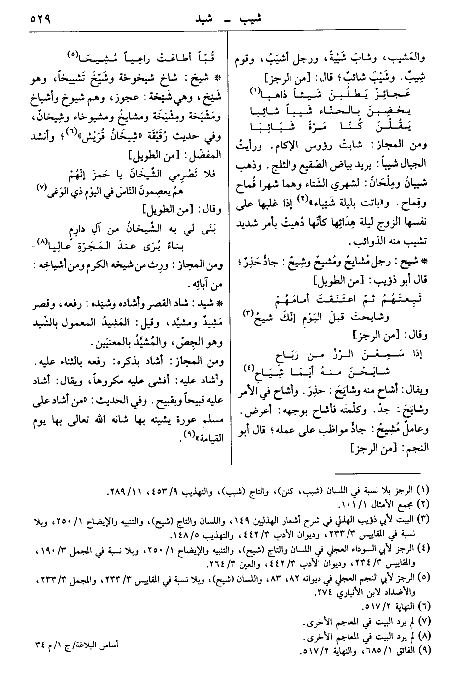 ومن المجاز: شابت رءوس الإكام. ورأيت الجبال شيباً: يريد بياض الصقيع والثلج. وذهب شيبان وملحان: لشهري الشتاء وهما شهرا قماح. و" باتت بليلة شيباء " إذا غلبها على نفسها الزوج ليلة هدائها كأنها دهيت بأمر شديد تشيب منه الذوائب.