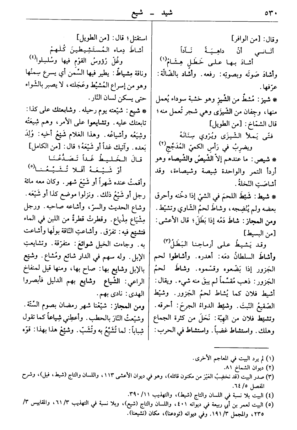وأقمت عنده شهراً أو شيع شهر. وكان معه مائة رجل أو شيع ذلك. ونزلوا موضع كذا أو شيعه. وشاع الحديث والسر، وأشاعه صاحبه. ورجل مشياع مذياع. وقطرت قطرة من اللبن في الماء فتشيع فيه: تفرق. وأشاعت الناقة بولها وأشاعت به. وجاءت الخيل شوائع: متفرقة. وتشايعت الإبل. وله سهم في الدار شائع ومشاع. وشيع بالإبل وشايع بها: صاح بها، ومنه قيل لمنفاخ الراعي: الشياع. وشايع بهم الدليل فأبصروا الهدى: نادى بهم.