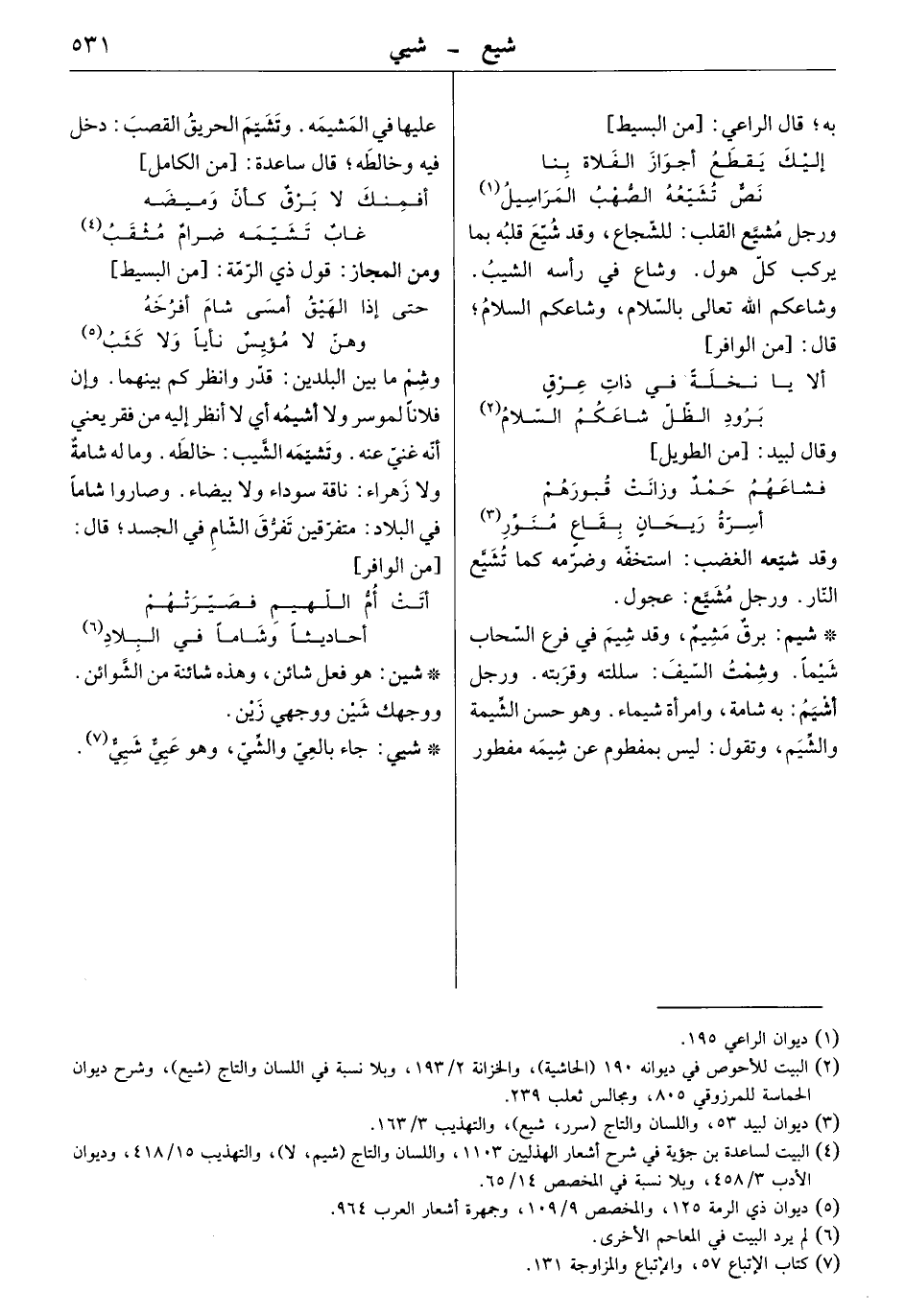 ورجل مشيع القلب: للشجاع، وقد شيع قلبه بما يركب كل هول. وشاع في رأسه الشيب. وشاعكم الله تعالى بالسلام، وشاعكم السلام. قال: