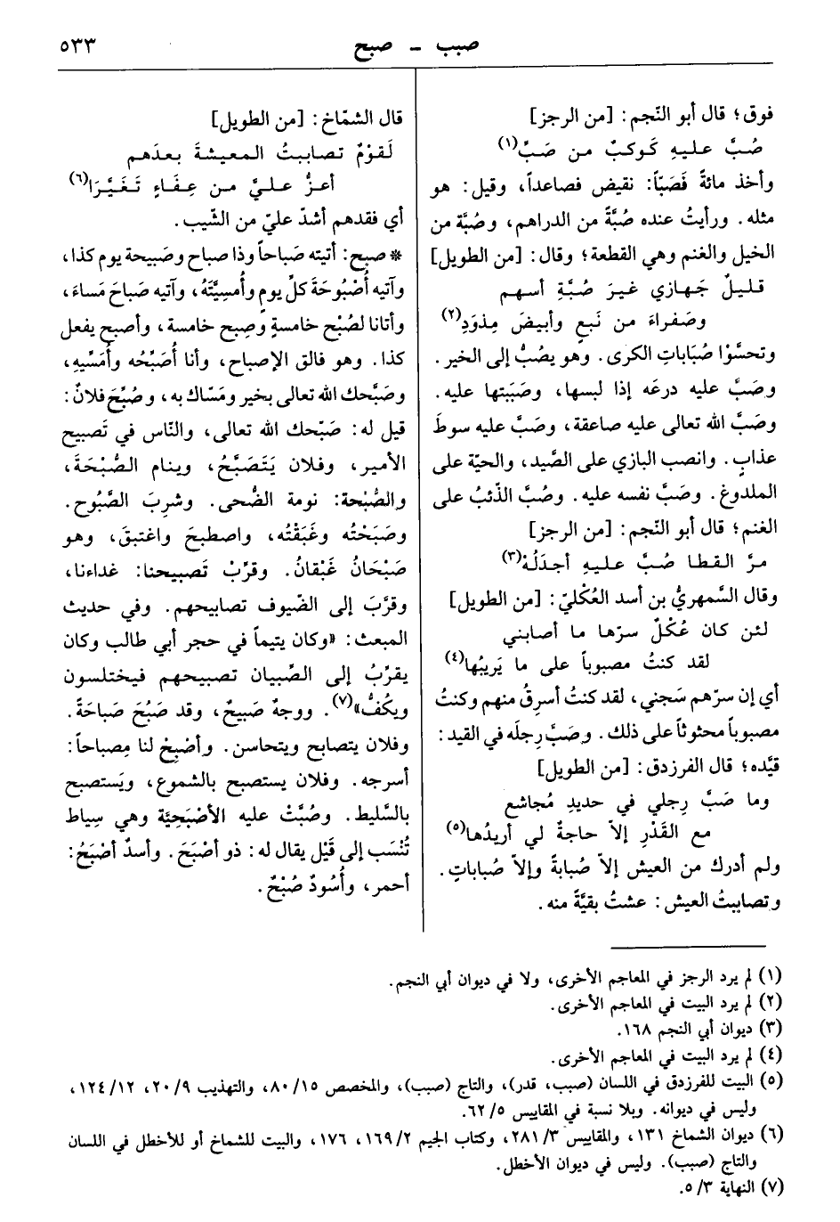 أتيته صباحاً وذا صباح وصبيحة يوم كذا، وآتيه أصبوحة كل يوم وأمسيته، وآتيه صباح مساء، وأتانا لصبح خامسة وصبح خامسة، وأصبح يفعل كذا. وهو فالق الإصباح، وأنا أصبحه وأمسيه، وصبحك الله تعالى، والناس في تصبيح الأمير، وفلان يتصبح، وينام الصبحة، والصبحة: نومة الضحى. وشرب الصبوح. وصبحته وغبقته، واصطبح واغتبق، وهو صبحان غبقان. وقرب تصبيحنا: غداءنا، وقرب إلى الضيوف تصابيحهم. وفي حديث المبعث " وكان يتيماً في حجر أبي طالب وكان يقرب إلى الصبيان تصبيحهم فيختلسون ويكف " ووجه صبيح، وقد صبح صباحة. وفلان يتصابح ويتحاسن. وأصبح لنا مصباحاً: أسرجه. وفلان يستصبح بالشموع، ويستصبح بالسليط. وصبت عليه الأصبحية وهي سياط تنسب إلى قيل يقال له: ذو أصبح. وأسد أصبح: أحمر، وأسود صبح.