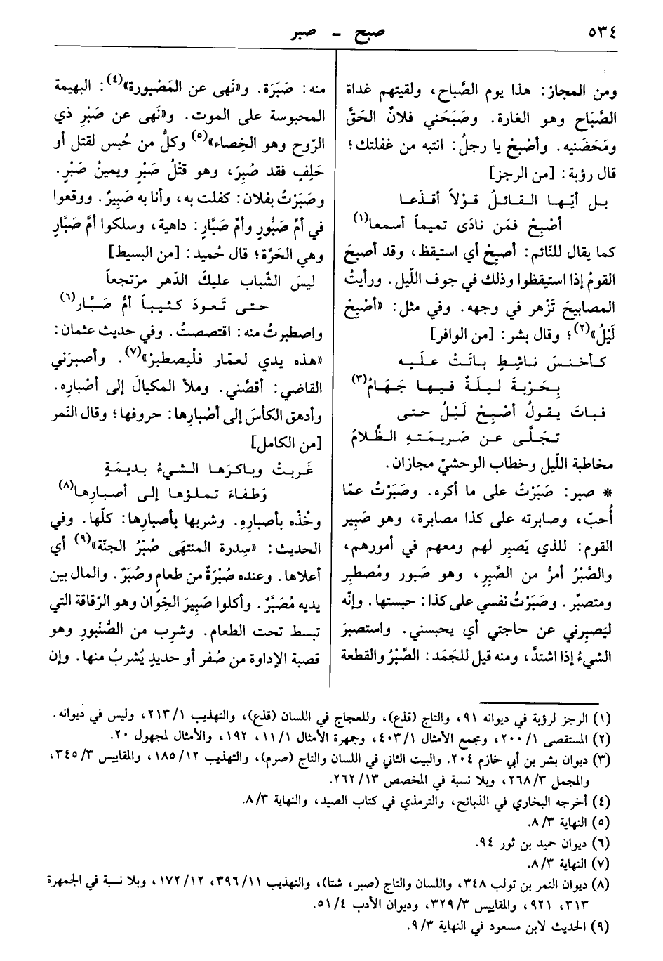 وخذه بأصباره. وشربها بأصبارها: كلها. وفي الحديث: " سدرة المنتهى صبر الجنة " أي أعلاها. وعنده صبرة من طعام وصبر. والمال بين يديه مصبر. وأكلوا صبير الخون وهو الرقاقة التي تبسط تحت الطعام. وشرب من الصنبور وهو قصبة الإداوة من صفر أو حديد يشرب منها. وإن