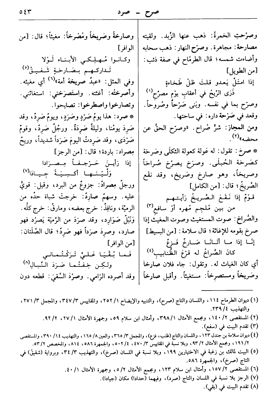 وصرحت الخمرة: ذهب عنها الزبد. ولقيته مصارحة: مجاهرة. وصرح النهار: ذهب سحابه وأضاءت شمسه. قال الطرماح في صفة ذئب: