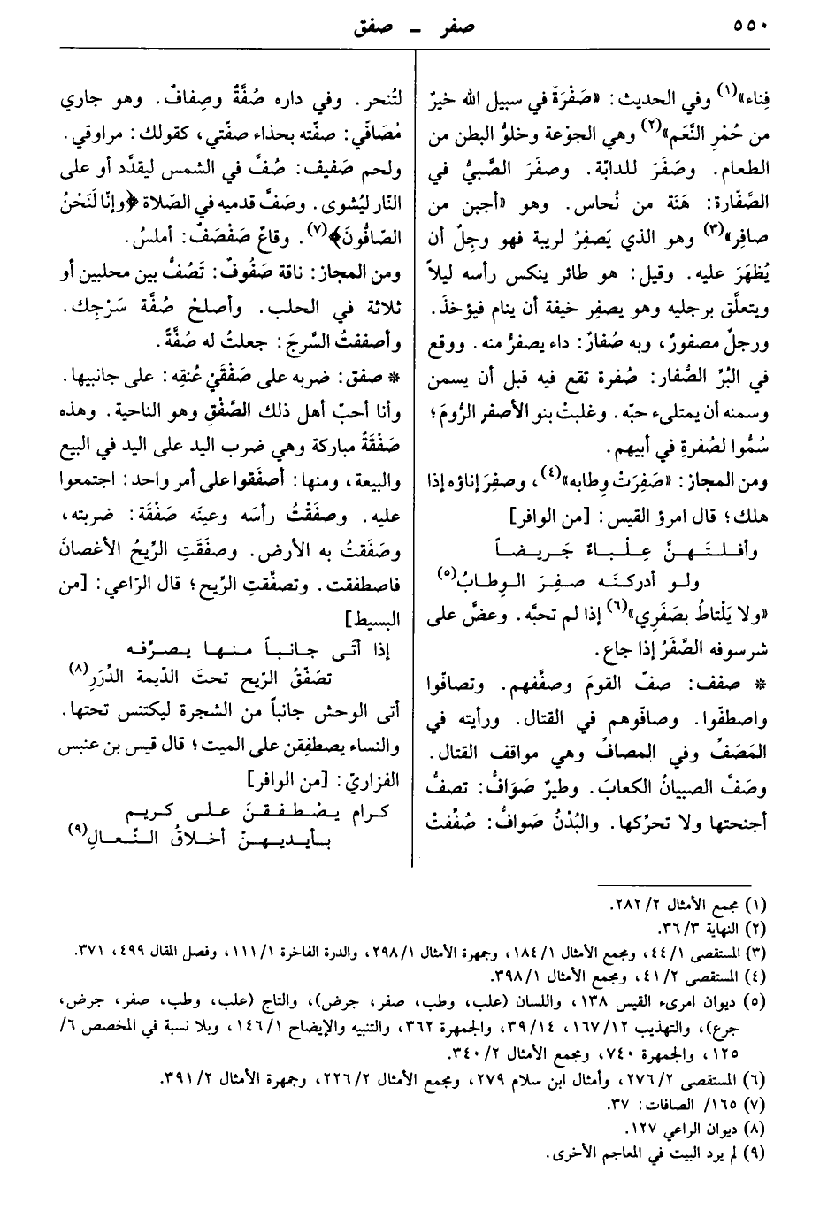 صف القوم وصففهم. وتصافوا واصطفوا. وصافوهم في القتال. ورأيته في المصف وفي المصاف وهي مواقف القتال. وصف الصبيان الكعاب. وطير صواف: تصف أجنحتها ولا تحركها. والبدن صواف: صففت لتنحر. وفي داره صفة وصفاف. وهو جاري مصافي: صفته بحذاء صفتي، كقولك: مراوقي. ولحم صفيف: صف في الشمس ليقدّد أو على النار ليشوى. وصف قدميه في الصلاة " وإنا لنحن الصافون " وقاع صفصف: أملس.