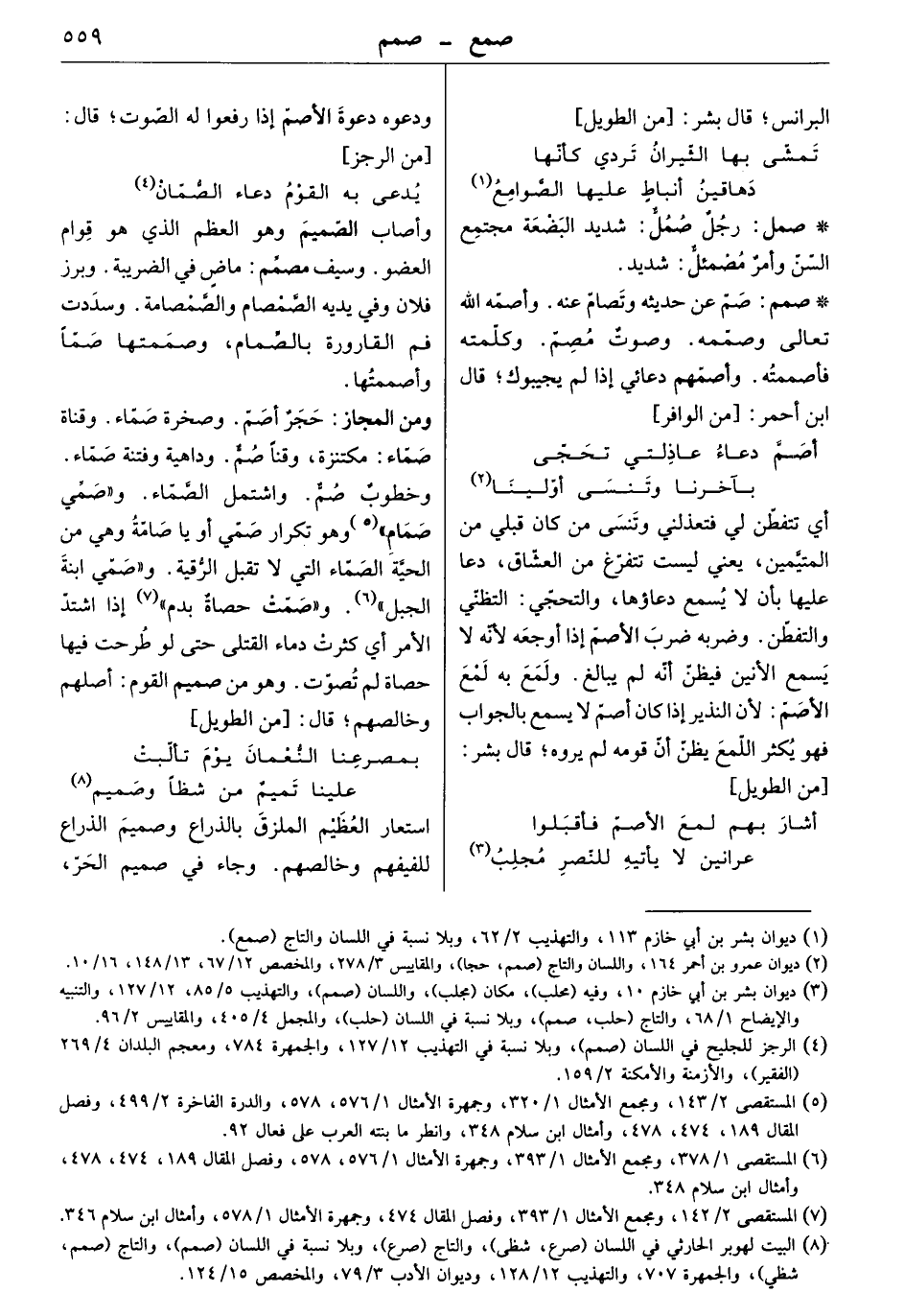 ومن المجاز: حجر أصم، وصخرة صماء. وقناة صماء: مكتنزة، وقناً صم. وداهية وفتنة صماء. وخطوب صم. واشتمل الصماء. " وصمى صمام " وهو تكرار صمي أو يا صامة وهي من الحية الصماء التي لا تقبل الرقية. " وصمى ابنة الجبل " " وصمت حصاة بدم " إذا اشتد الأمر أي كثرت دماءه القتلى حتى لو طرحت فيها حصاة لم تصوت. وهو من صميم القوم: أصلهم وخالصهم. قال: