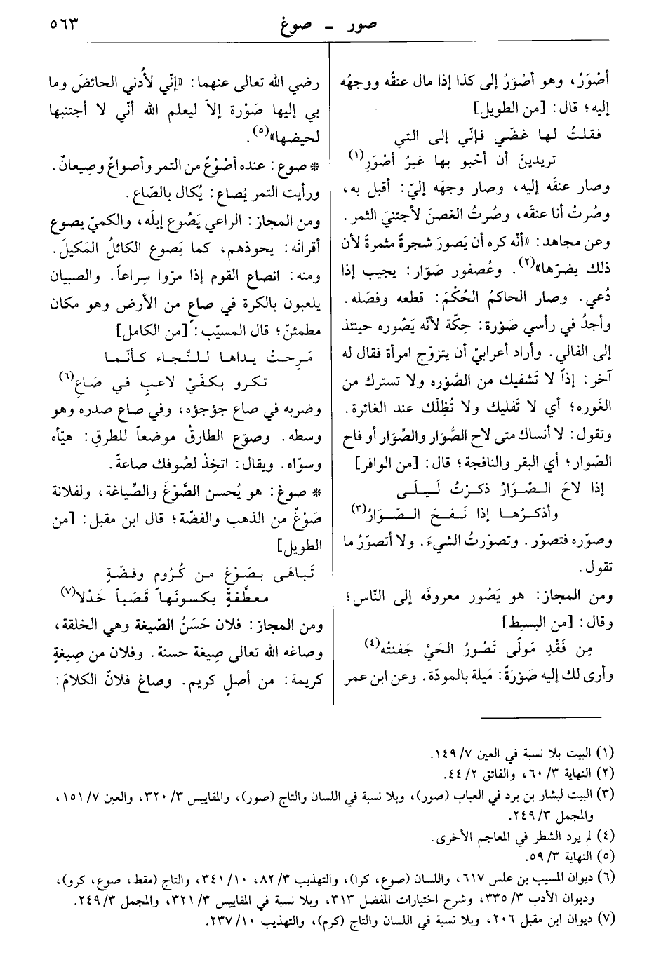 وصار عنقه إليه، وصار وجهه إليّ: أقبل به، وصرت أنا عنقه، وصرت الغصن لأجتني الثمر. وعن مجاهد أنه كره أن يصور شجرة مثمرة لأن ذلك يضرها. وعصفور صوّار: يجيب إذا دعي. وصار الحاكم الحكم: قطعه وفصله. وأجد في رأسي صورة: حكة لأنه يصوره حينئذ إلى الفالي. وأراد أعرابيّ أن يتزوج امرأة فقال له آخر: إذاً لا تشفيك من الصورة، ولا تسترك من الغوره؛ أي لا تفليك ولا تظلّك عند الغائرة. وتقول: لا أنساك متى لاح الصوار، أو فاح الصوار؛ أي البقر والنافجة. قال: