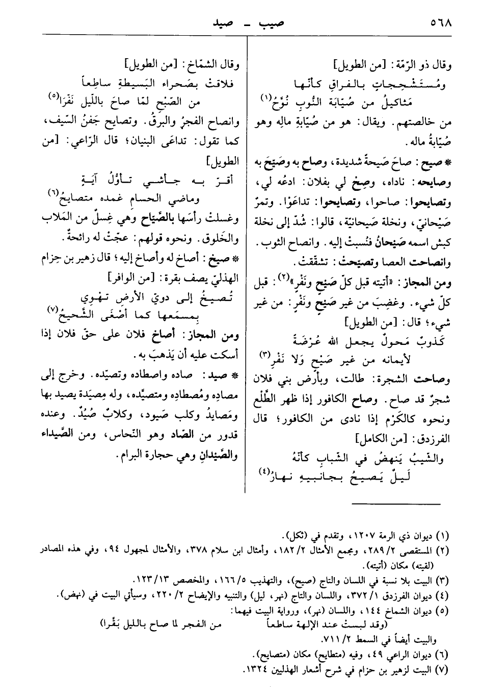 صاده واصطاده وتصيده، وخرج إلى مصاده ومصطاده ومتصيده، وله مصيدة يصيد بها ومصايد. وكلب صيود، وكلاب صيد. وعنده قدور من الصاد وهو النحاس، ومن الصيداء والصيدان وهي حجارة البرام.