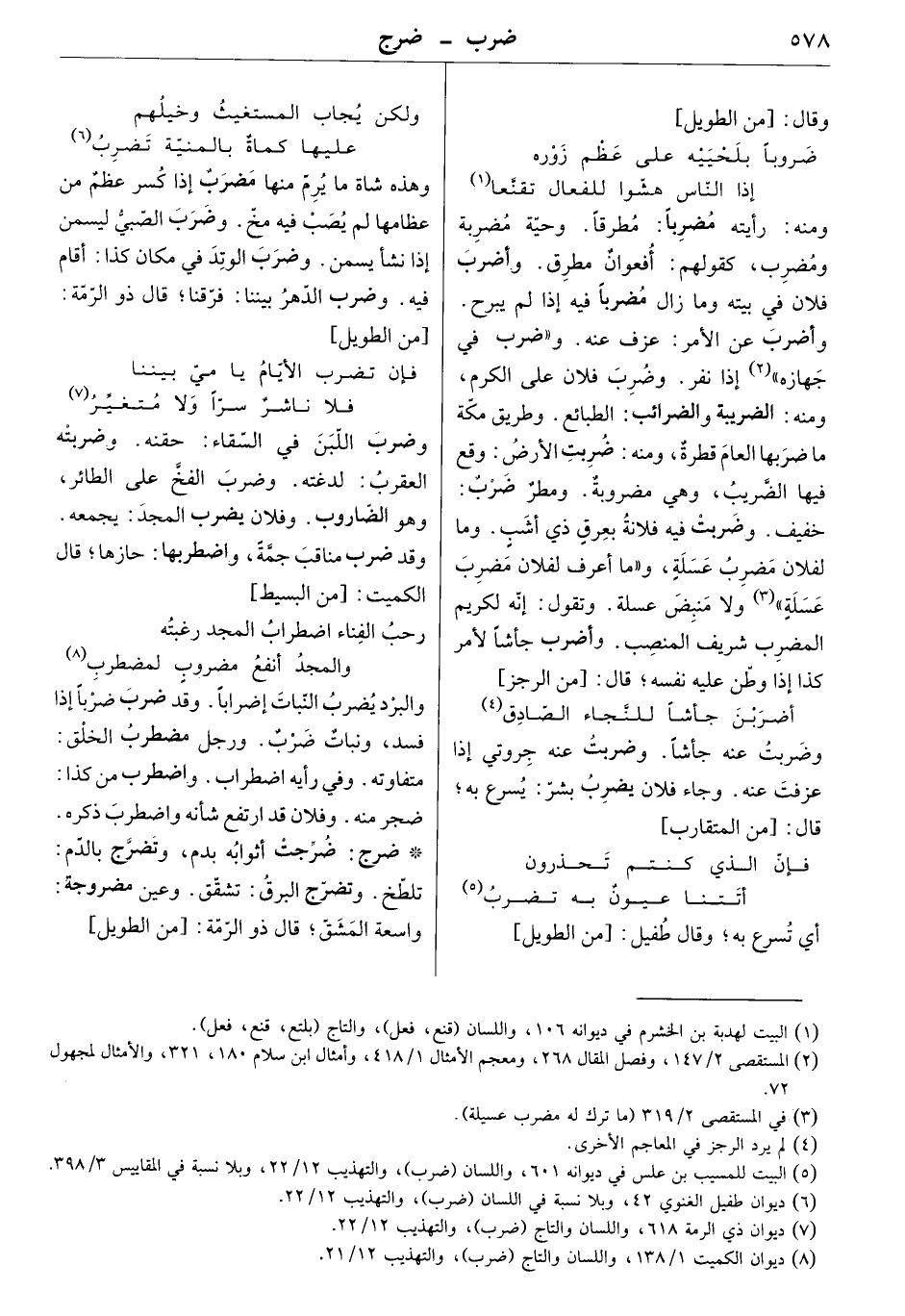 وهذه شاة ما يرم منها مضرب إذا كسر عظم من عظامها لم يصب فيه مخ. وضرب الصبي ليسمن إذا نشأ يسمن. وضرب الوتد في مكان كذا: أقام فيه. وضرب الدهر بيننا: فرقنا. قال ذو الرمة: