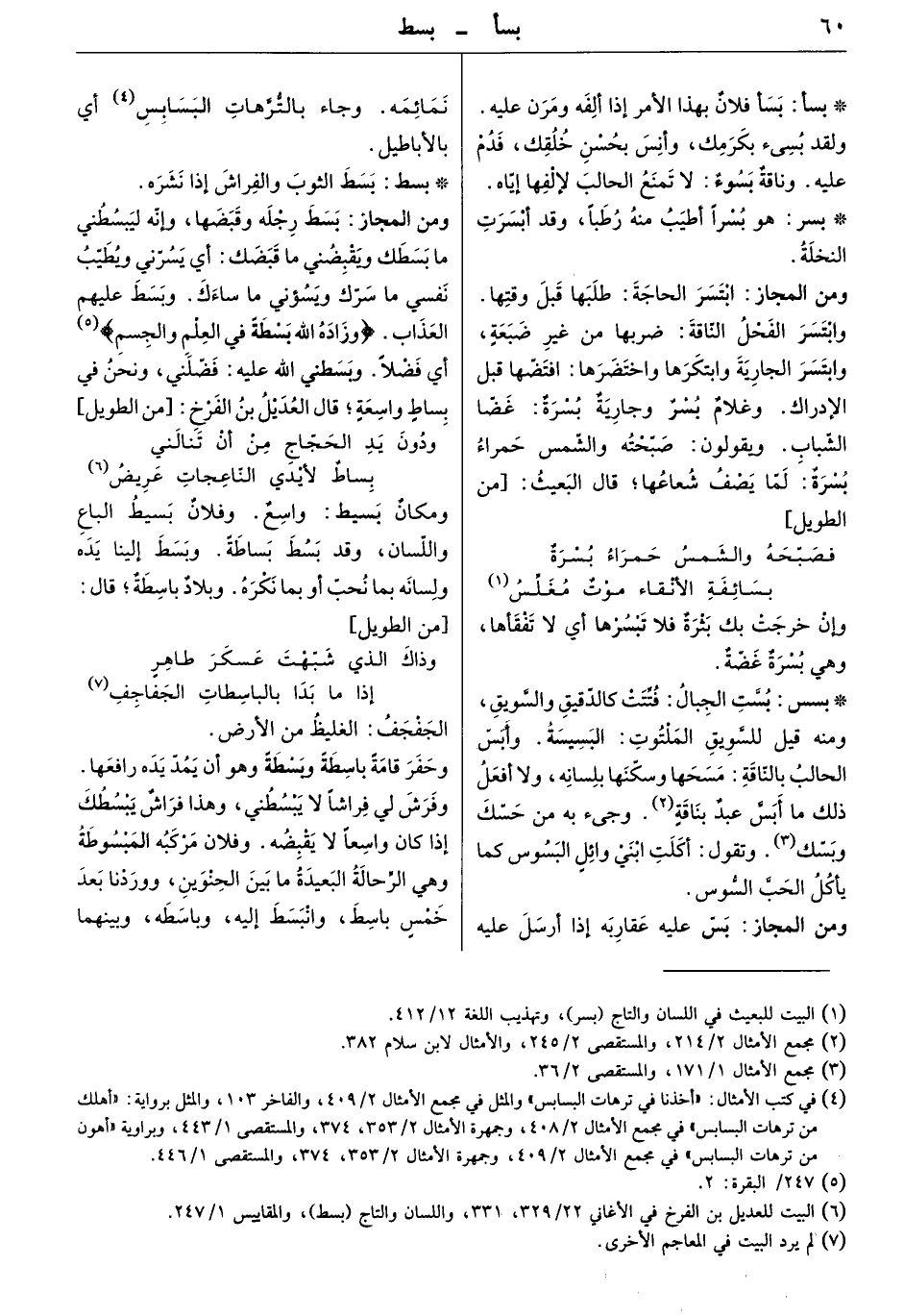 وحفر قامة باسطة وبسطة وهو أن يمد يده رافعها. وفرش لي فراشاً لا يبسطني، وهذا فراش يبسطك إذا كان واسعاً لا يقبضه. وفلان مركبه المبسوطة وهي الرحالة البعيدة ما بين الحنوين، ووردنا بعد خمس باسط وانبسط إليه، وباسطه، وبينهما