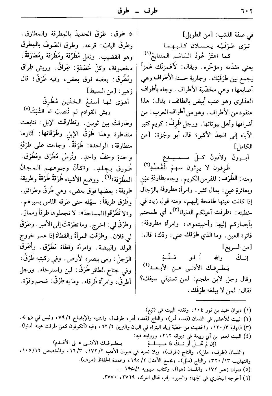 ومنه: الطرف: للفرس الكريم. وجاء بطارفة عين وبعائرة عين: بمال كثير: وامرأة مطروفة بالرجال إذا كانت عينها طامحة إليهم، ومنه: قول زياد في خطبته: طرفت أعينكم الدنيا أي طمحتم بأبصاركم إليها وأحببتموها، وامرأة مطروفة: فاترة العين. وما الذي طرفك عني: ردك. قال: