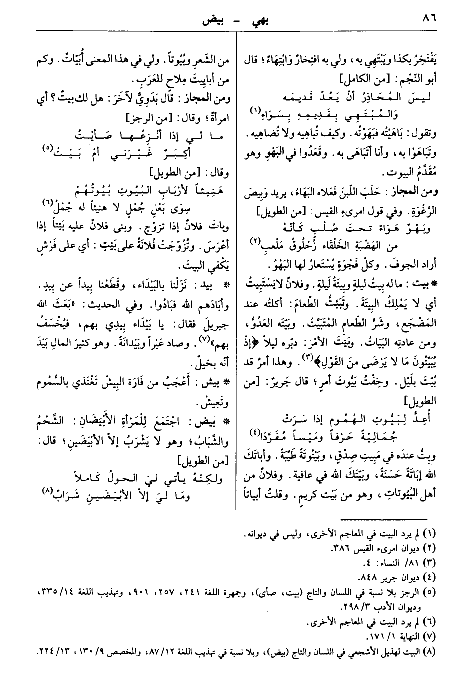 وبت عنده في مبيت صدق، وبيتوتة طيبة. وأباتك الله إباتة حسنة، وبيتك الله في عافية. وفلان من أهل البيوتات، وهو من بيت كريم. وقلت أبياتاً من الشعر وبيوتاً. ولي في هذا المعنى أبيات. وكم من أبا بيت ملاح للعرب.