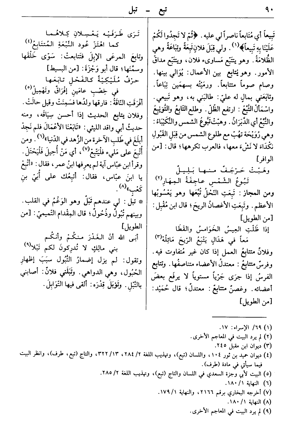 تبيعاً أي متابعاً ناصراً لي عليه " ثم لا تجدوا لكم علينا به تبيعاً " ولي قبل فلان تبعة وتباعة وهي الظلامة. وهو يتتبع مساوي فلان، ويتتبع مداق الأمور. وهو يتابع بين الأعمال: يوالي بينها. وصام صوماً متتابعاً. ورميته بسهمين تباعاً. وتابعني بمال له عليّ: طالبني به، وهو تبيعي. واسمأل التبع: ارتفع الظل. وطلع التابع والتوبيع والتبع أي الدبران. وهبت تبوع الشمس والنكيباء وهي ريوحة تهب مع طلوع الشمس من قبل القبول نكداء لا نشء معها، فالعرب تكرهها. قال: