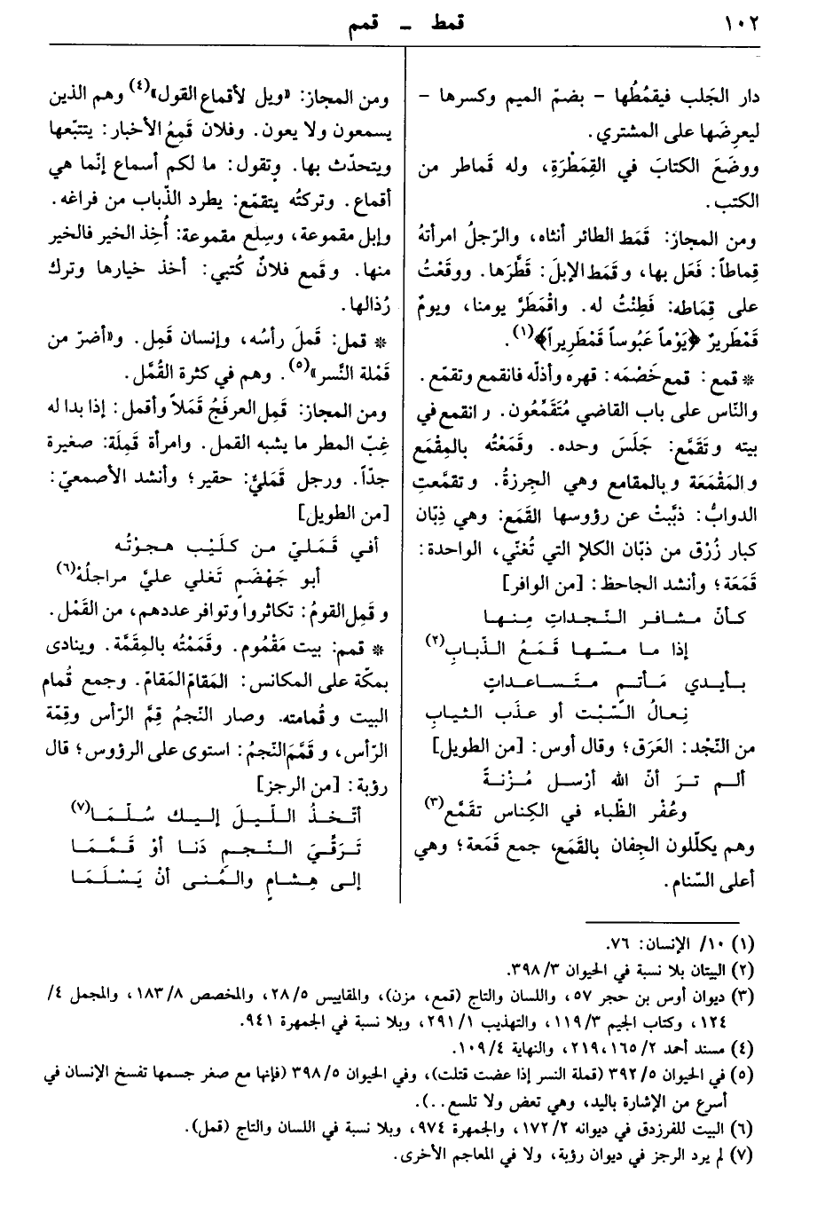 بيت مقموم. وقممته بالمقمّة. وينادي بمكة على المكانس: المقامّ المقامّ. وجع قمام البيت وقمامته. وصار النجم قمّ الرأس وقمّة الرأس، وقمّ النجم: استوى علىة الرءوس. قال رؤبة: