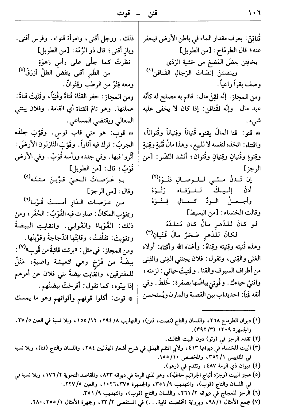 ومن المجاز: حفر النقاء قناة وقنياً، وقنّيت قناةً: عملتها. وهو تام القناة أي القامة. وفلان يبتني المعالي، ويقتني المساعي.