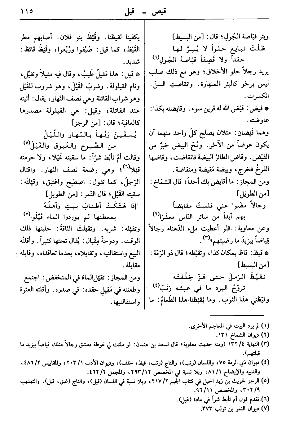 وتقيّله: شربه. وتقيّلت الناقة: حلبتها ذلك الوقت. ودوحةٌ مقيال: يقال تحتها كثيراً. وأقلته البيع واستقالنيه، وتقايلاه، بعد ما تعاقداه، وقايله مقايلة.