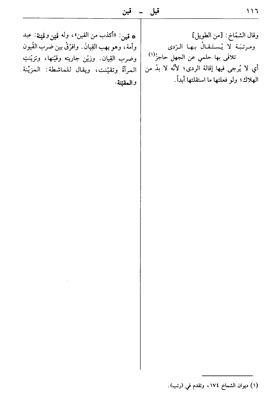 " أكذب من القين "، وله قي وقينة: عبد وأمة، وهو يهب القيان. وافرقي بين ضرب القيون وضرب القيان. وزيّن جاريته وقيّنها، وتزيّنت المرأة وتقيّنت، ويقا للماشطة: المزيّنة والمقيّنة.