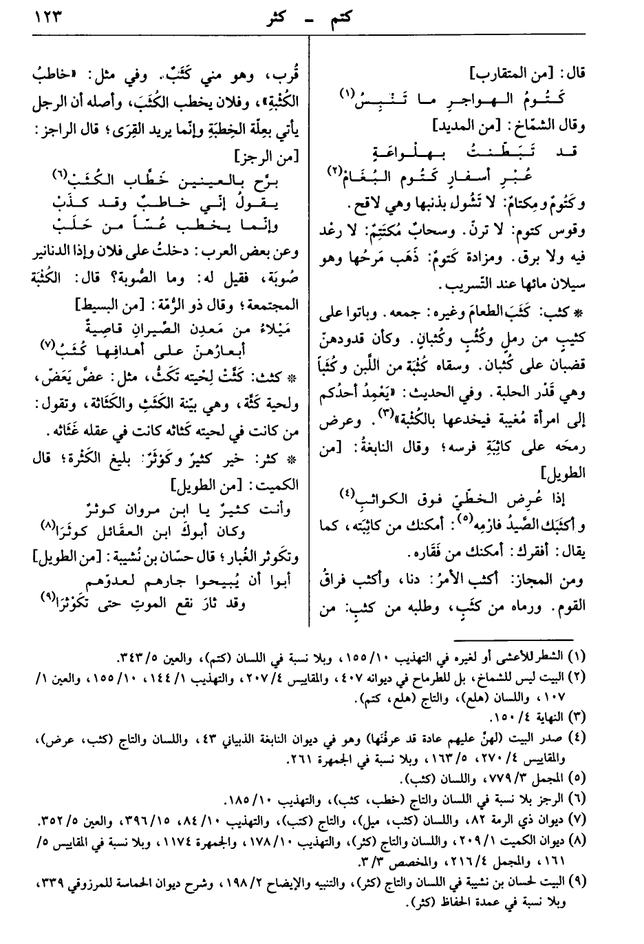 كثب الطعام وغيره: جمعه. وباتوا على كثيبٍ من رملٍ وكثب وكثبان. وكأن قدودهنّ قضبان، على كثبان. وسقاه كثبة من اللّبن وكثباً وهي قدر الحلبة. وفي الحديث: " يعمد أحدكم إلى امرأة مغيبة فيخدعها بالكثبة " وعرض رمحه على كاثبة فرسه. وقال النابغة: