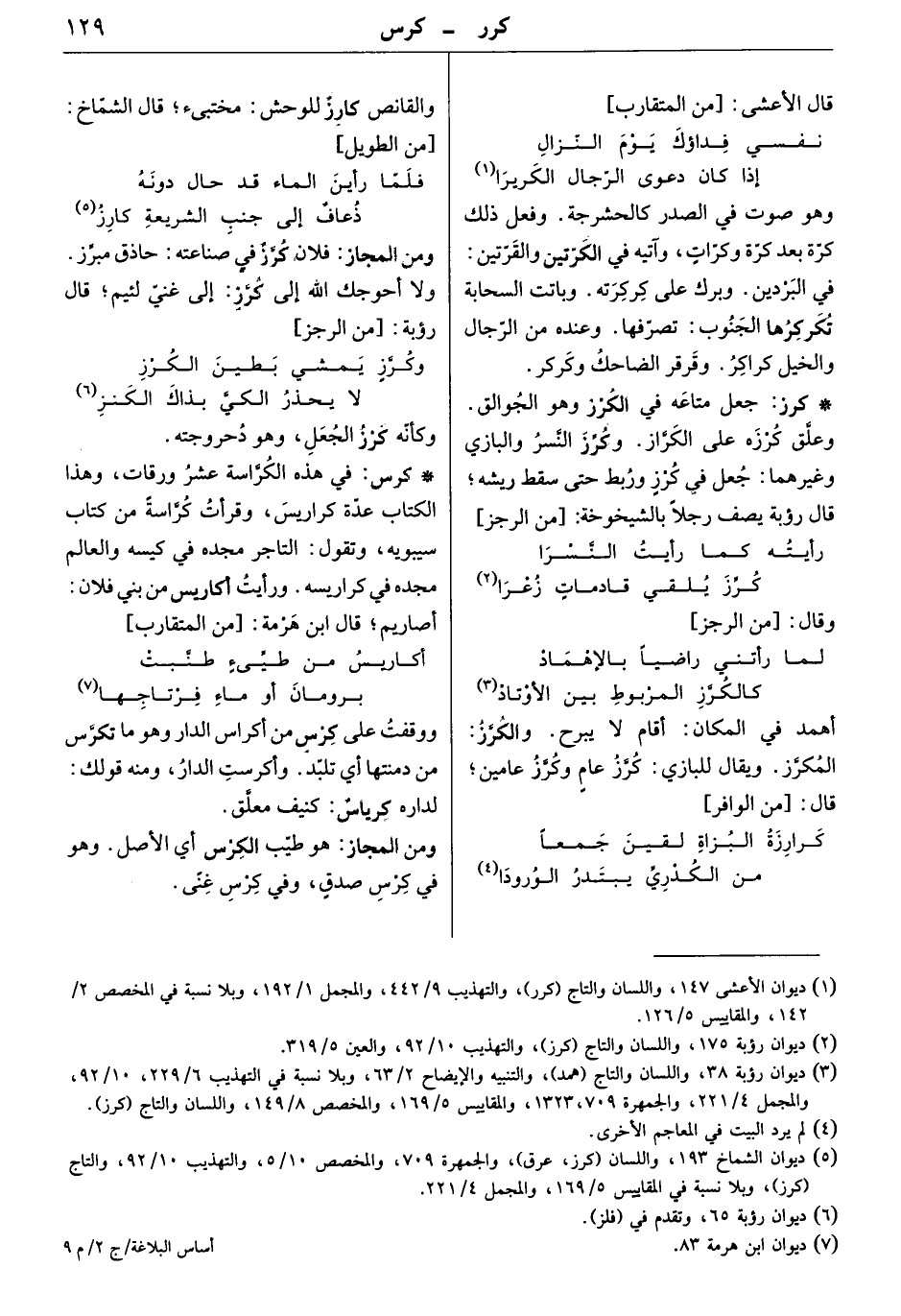 ومن المجاز: فلان كرّزٌ في صناعته: حاذق مبرّز. ولا أحوجك الله إلى كرّزٍ: إلى غنيّ لئيم. قال رؤبة: