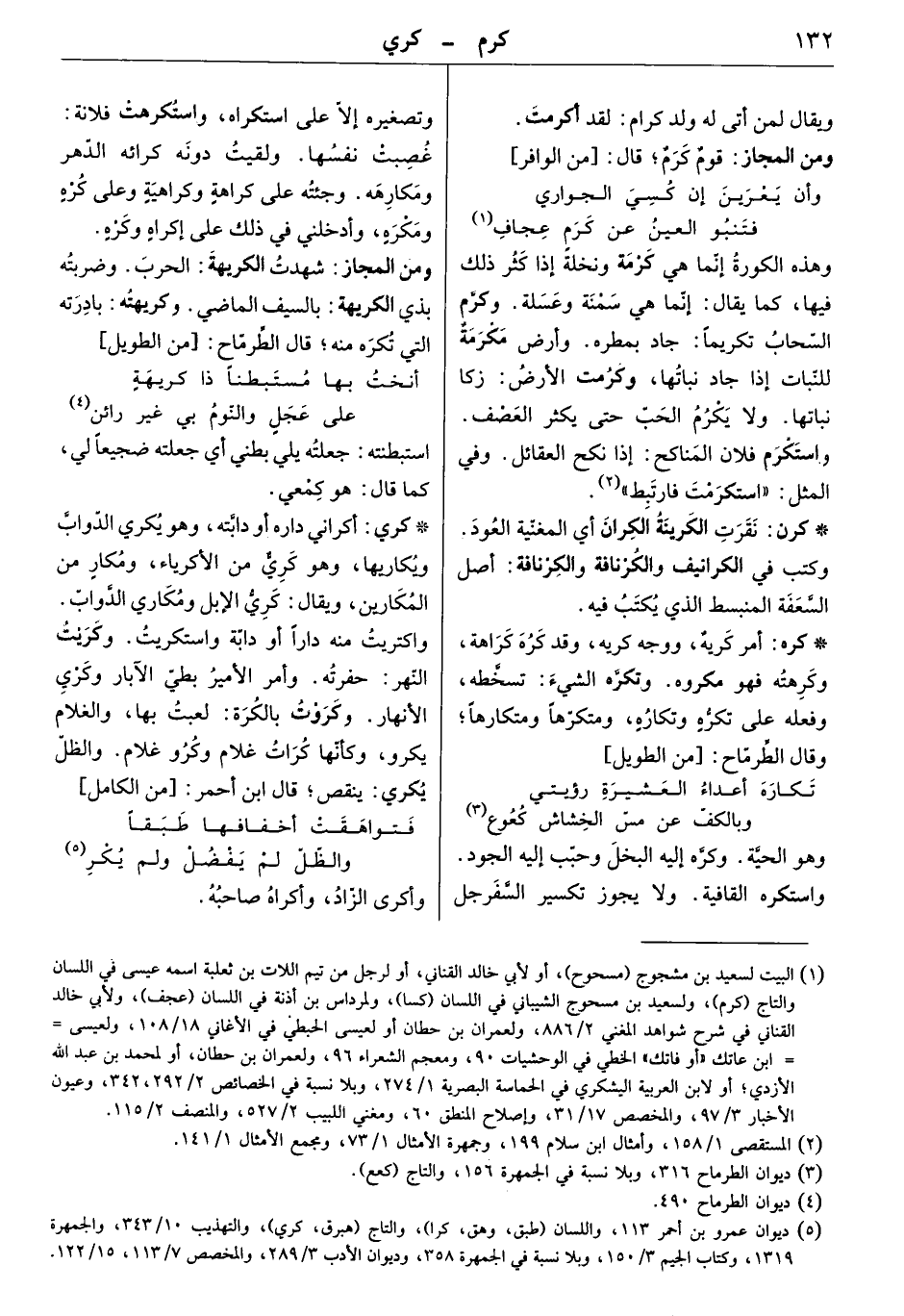 وهو الحيّة. وكرّه إليه ابخل وحبّب إليه الجود. واستكره القفية. ولا يجوز تكسير السّفرجل وتصغيره إلا على استكراه. واستكرهت فلانة: غصبت نفسها. ولقيت دونه كرائه الدهر ومكارهه. وجئته على كراهةٍ وكراهية وعلى كرهٍ. ومكرهٍ، وأدخلني في ذلك على إكراهٍ وكرهٍ.