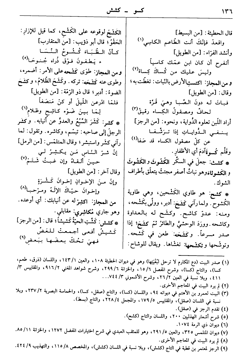 هو طاوي الكشحين، وهي طاوية الكشوح. ولما رآني كشح: أدبر، وولّى بكشحه، ومنه: عدوّ كاشح. وكشح له بالعداوة وكاشحه. وورد الوحشيّ والطائر ثم كشح إذا صدر مسرعاً. وكشحه: طعن في كشحهز. وتوشحها وتكشحها: تغشّاها. ويقال للوشاح: الكشح لوقوعه على الكشح، كما قيل: للإزار: الحقو. قال أبو ذؤيب: