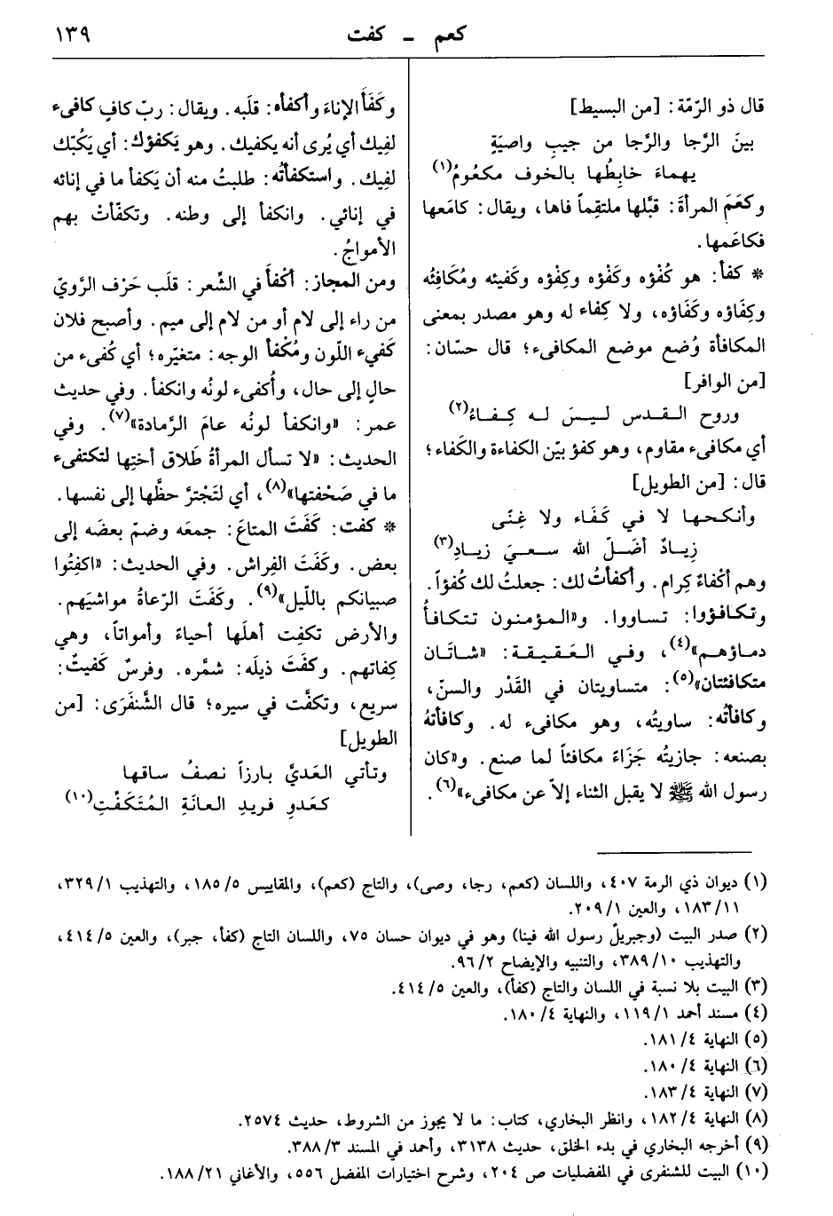 هو كفؤه وكفيئه ومكافئه وكفاؤه، ولا كفاء له وهو مصدر بمعنى المكافأة وضع موضع المكافيء. قال حسّان: