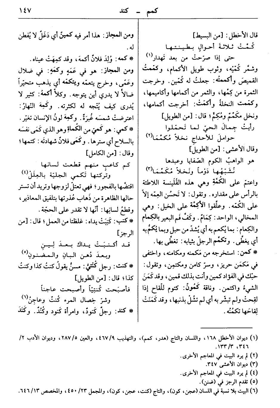 واعتمّ على الكمّة وهي هذه القلينسة اللاطئة بالرأس على مقداره. وتقول: لا تحسن العمّة، إلا على الكمه. وعلّقوا الأكمّة على الخيل وهي المخالي، الواجد: كمامٌ. وكفّ فم البعير: بالكمام والعام بما يكعم به أي يشدّ من حبل وبما يكم به أي يغطّى. وتكّم الرجل بثيابه: تغطّى بها.