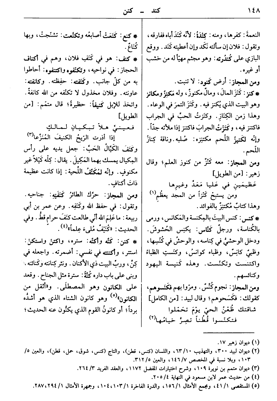 كنّه وأكنّه: ستره، واكتنّ واستكنّ: استتر، وأكننته في نفسي: أضمرته. واجعله في كنّ، وربّ البيت ذي الأكنان. ونثر كنانته وكنائنه. وبنى على باب داره كنّةً: سترة مثل الجناح. وقعد على الكانون وهو المصطلى. " وأثقل من الكانون " وهو كانون الشتاء الذي هو أشده برداً أو كانون القوم الذي يكنّون عنه الحديث.