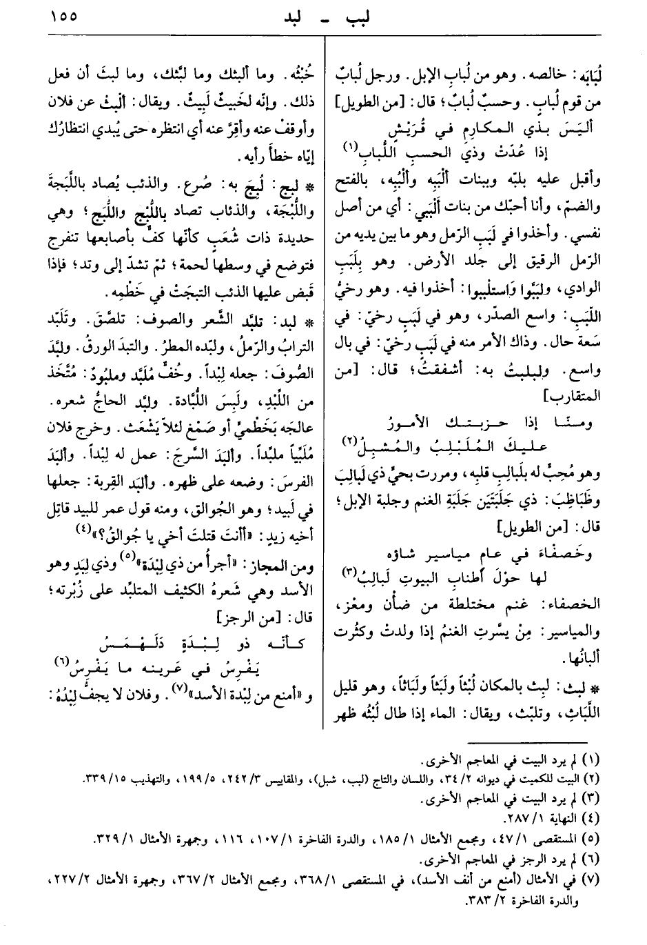 وأقبل عليه بلبه وببنات ألببه وألببه بالفتح والضمّ، وأنا أحبك من بنات أببي أي من أصل نفسي. وأخذوا في لبب الرمل وهو ما بين يده من الرمل الرقيق إلى جلد الأرض. وهو بلبب الوادي، ولبّبوا واستلببوا: أخذوا فيه. وهو رخيّ اللبب: واسع الصدر. وهو في لببٍ رخيٍّ: في سعة حال. وذاك الأمر منه في لبب رخيّ: في بال واسع. ولبلبت به: أشفقت. قال: