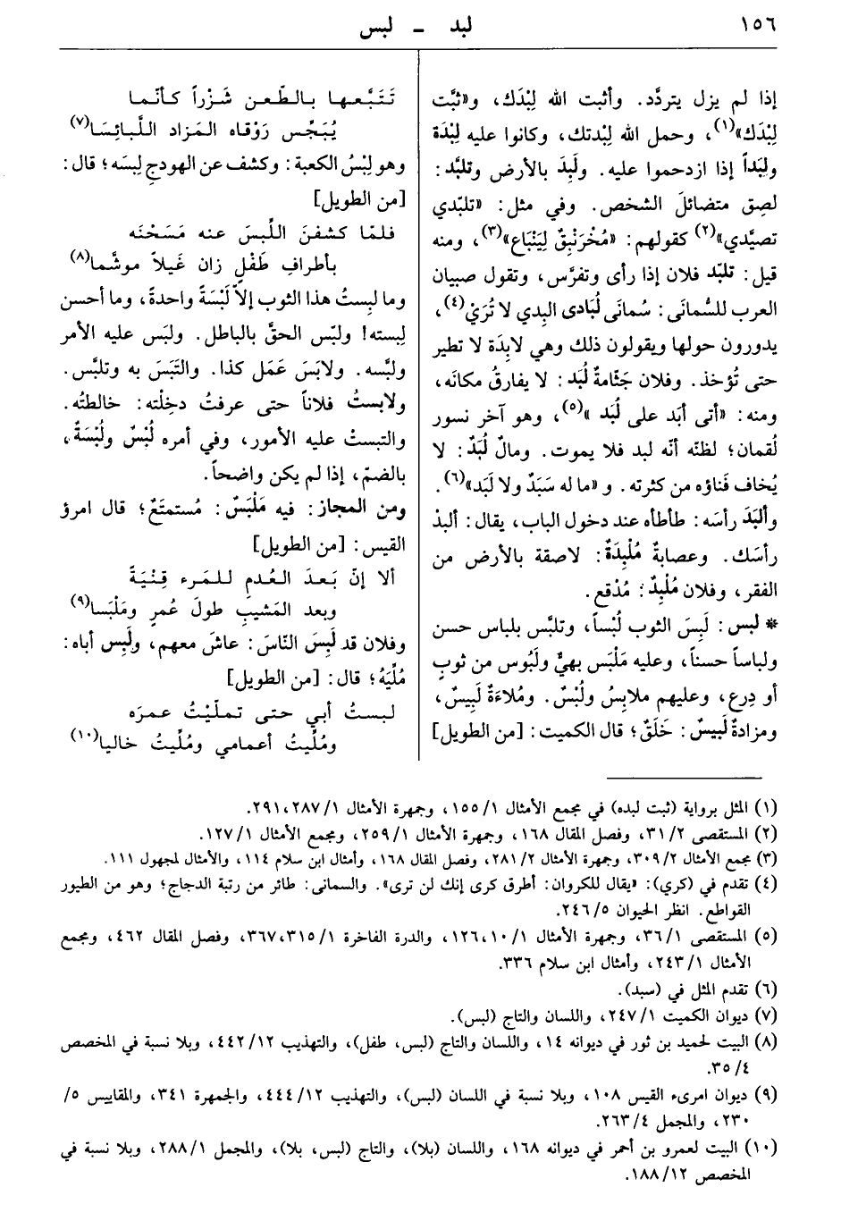 إذا لم يزل يتردّد. وأثبت الله لبدك، وثبّت لبدك، وحمل الله لبدتك، وكانوا عليه لبدة ولبدا إذا ازدحموا عليه. ولبد بالأرض وتلبّد: لصق متضائل الشخص. وفي مثل " تلبّدي تصيّدي " كقولهم: " مخرنبق لينباع "، ومنه قيل: تلبد فلان إذا رأى وتفرّس، وتقول صبيان العرب للسمانى: سمانى لبادي البيدي لا ترى: يدورون حولها ويقولون ذلك وهي لابدة لا تطير حتى تؤخذ. وفلان جثّامةٌ لبد: لا يفارق مكانه، ومنه أتى أبد، على لبد؛ وهو آخر نسور لقمان لظنّه أنه لبد فلا يموت. ومال لبدٌ، لا يخاف فناؤه من كثرته. و" ماله سبدٌ ولا لبد ". وألبد رأسه: طأطأه عند دخول الباب، يقال: ألبد رأسك. وعصابة ملبدة: لاصقة بالأرض من الفقر، وفلان ملبد: مدقع.