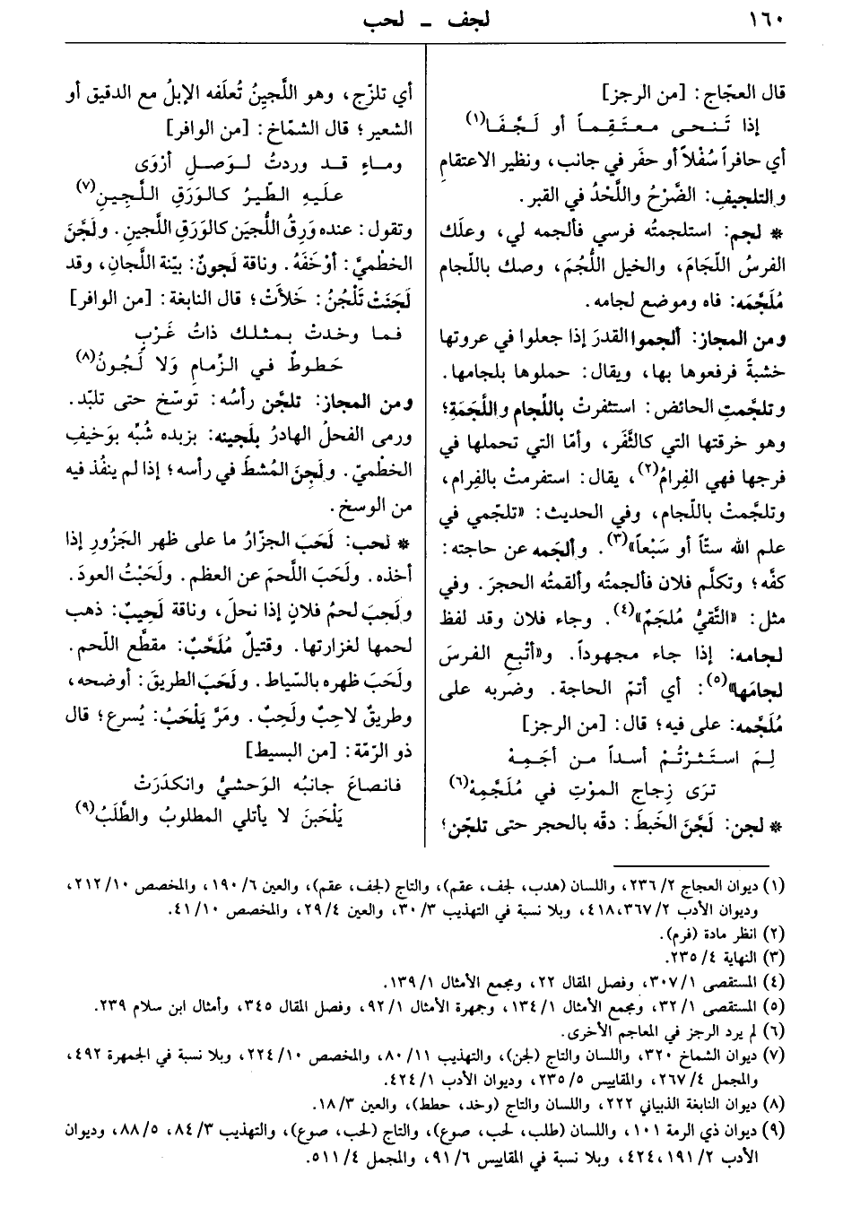 ومن المجاز: ألجموا القدر إذا جعلوا في عروتها خشبةً فرفعوها بها، ويقال: حملوها بلجامها. وتلجّمت الحائض. استثفرت باللجام واللّجة وهو خرقتها التي كالثّفر، وأما التي تحملها في فرجها فهي الفرام، يقال: استفرمت بالفرام، وتلجّمت باللّجام، وفي الحديث: " تلجّمي في علم الله ستاً أو سبعاً " وألجمه عن حاجته: كفّه؛ وتكلّم فلان فألجمته وألقمته الحجر. وفي مثل " التّقيّ ملجمٌ " وجاء فلان وقد لفظ لجامه إذا جاء مجهوداً. وأتبع الفرس لجامها أي أتمّ الحاجة. وضربه على ملجّمه: على فيه. قال: