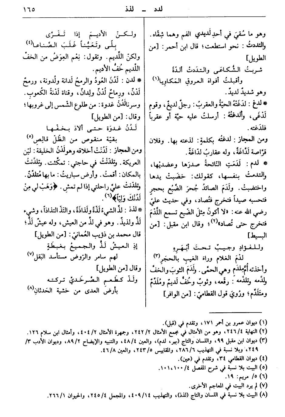 لذّ الشيء لذةً ولذاذةً، والتذ التذاذاً، وشيء لذٌ ولذيذ. وهو في لذّ من العيش، وله عيش لذّ. قال محمد بن ذؤيب العماني: