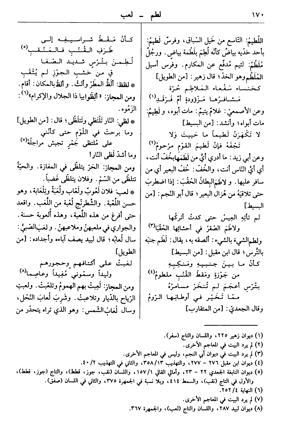 ومن المجاز: لعبت بهم الهموم وتلعبت. ولعبت الرياح بالدّيار وتلاعبت. وشرب لعاب النحل، وسال لعاب الشمس وهو الذي تراه يتحدّر من