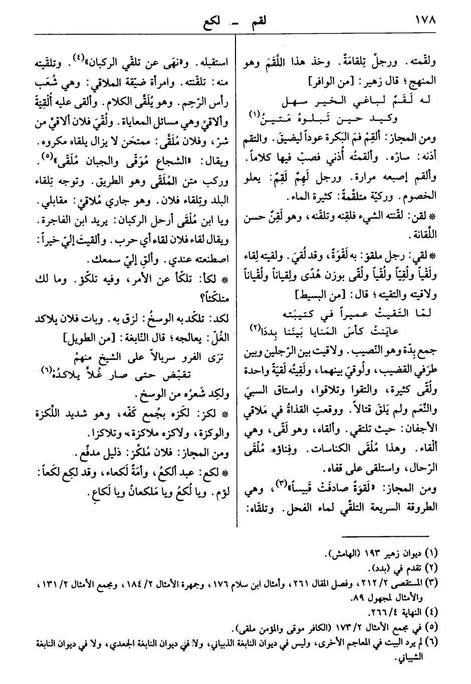 جمع بدّة وهو النصيب. ولاقيت بين الرجلين وبين طرفي القضيب، ولوقي بينهما، ولقيته لقيةً واحدة ولقًى كثيرة، والتقوا وتلاقوا، واستاق السبيَ والنعم ولم يلق قتالاً. ووقعت القذاة في ملاقي الأجفان: حيث تلتقي. وألقاه، وهو لقًى، وهي ألقاء. وهذا ملقى الكناسات. وفناؤه ملقى الرحال، واستلقى على قفاه.