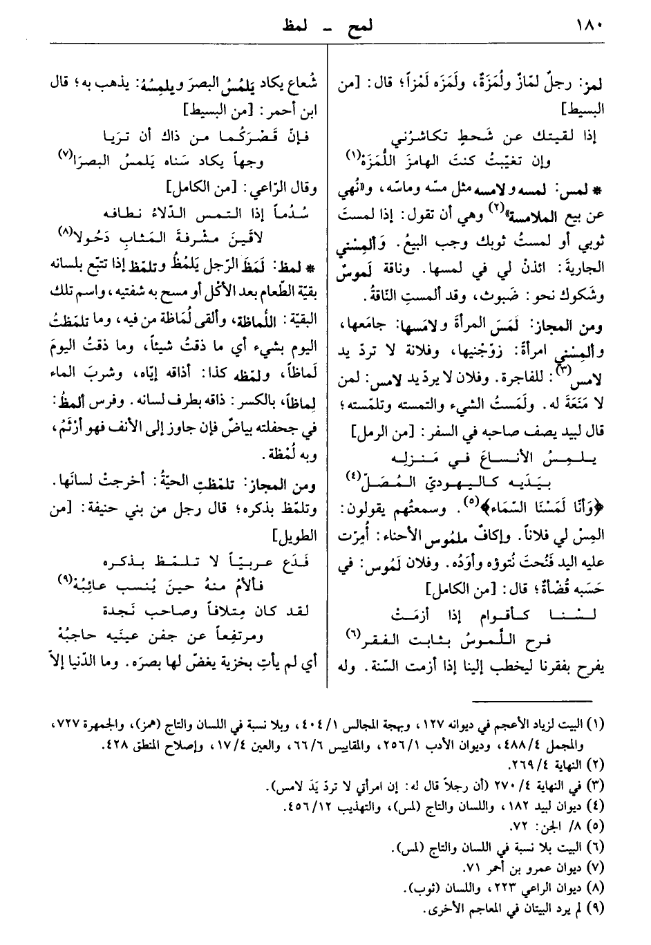 " وأنّا لمسنا السّماء ". وسمعتهم يقولون: المس لي فلاناً. ويا كافٌ ملموس الأحناء: أمرّت عليه اليد فتحت نتوءه وأوده: وفلان لموس: في حسبه قضاةٌ. قال: