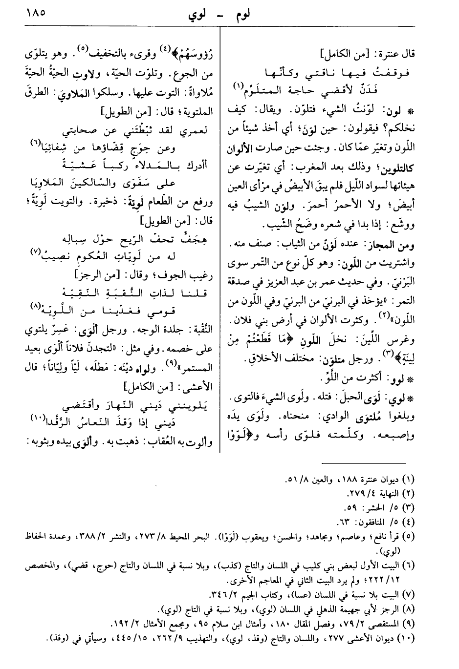 لوى الحبل: فتله. ولوى الشيء فالتوى. وبلغوا ملتوى الوادي: منحناه. ولوى يده وإصبعه. وكلّمته فلوّى رأسه و" لوّوا رءوسهم " وقرىء بالتخفيف. وهو يتلوّى من الجوع. وتلوّت الحية، ولاوت الحية الحية ملاواة: التوت عليها. وسلكوا الملاوي: الطرق الملتوية. قال: