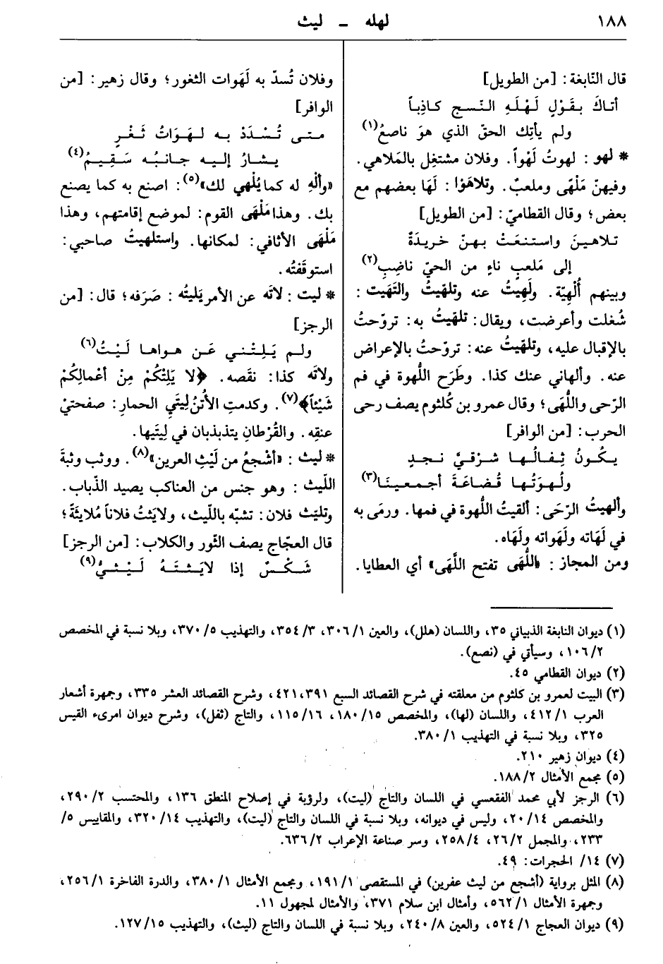 " أشجع من ليث العرين ". ووثب وثبة الليث وهو جنس من العناكب يصيد الذباب. وتليّث فلان: تشبّه بالليث، ولا يثت فلاناً ملايثة. قال العجاج يصف الثور والكلاب: