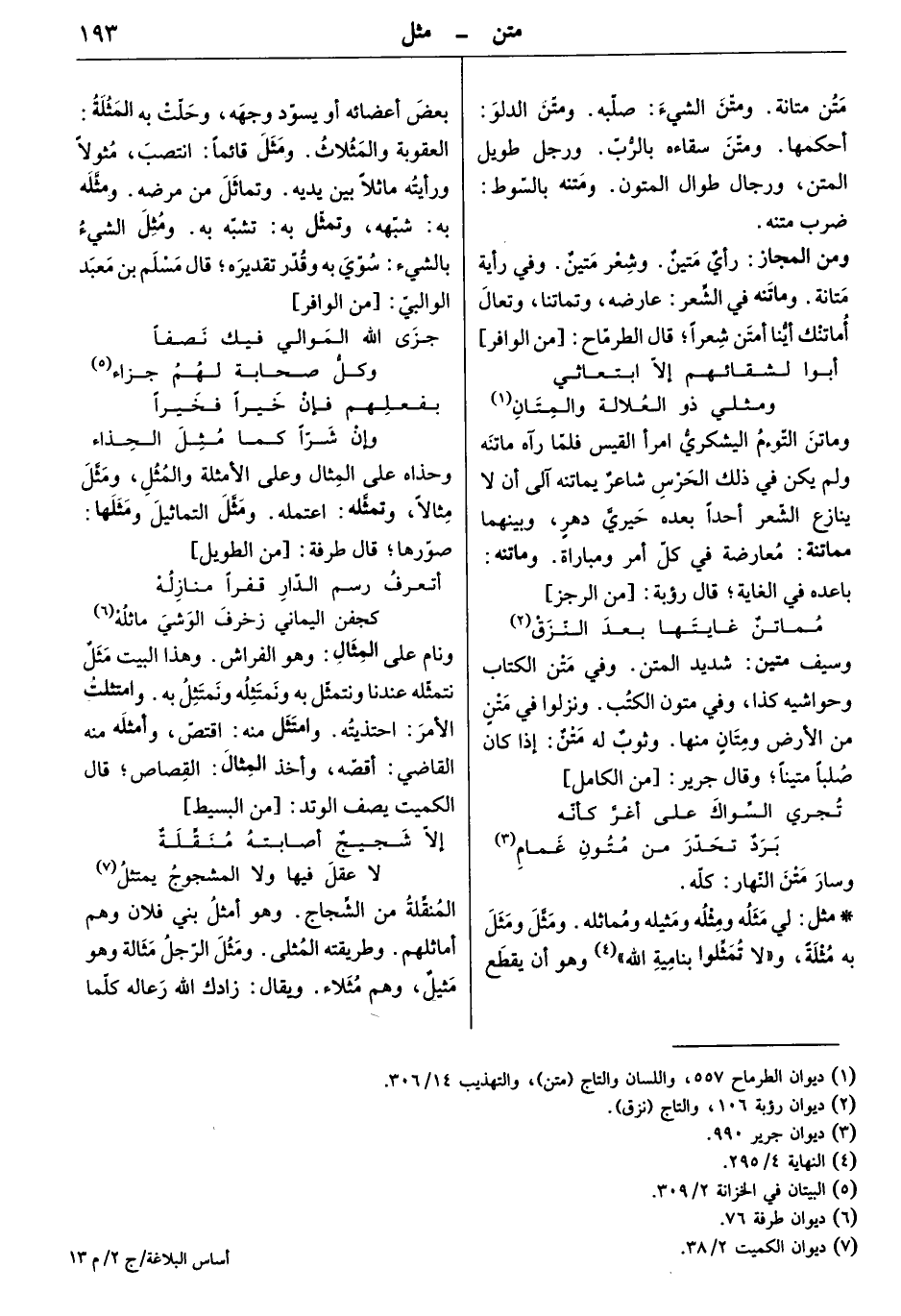 ومن المجاز: رأيٌ متين. وشعر متين. وفي رأيه متانة. وماتنه في الشعر: عارضه وتماتنا، وتعال أماتنك أينا أمتن شعراً. قال الطرماح: